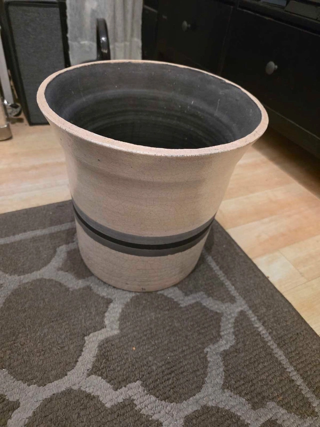 This is a used large ceramic flower pot featuring a stylish design with neutral tones and a horizontal stripe. Perfect for adding a touch of elegance to your garden or indoor space. It has a good size for various plants. Here are the approximate dimensions: * Diameter: 12 inches * Height: 14 inches I'm selling this flower pot because I'm redecorating my garden and no longer need it. If the ad is up, it's available!