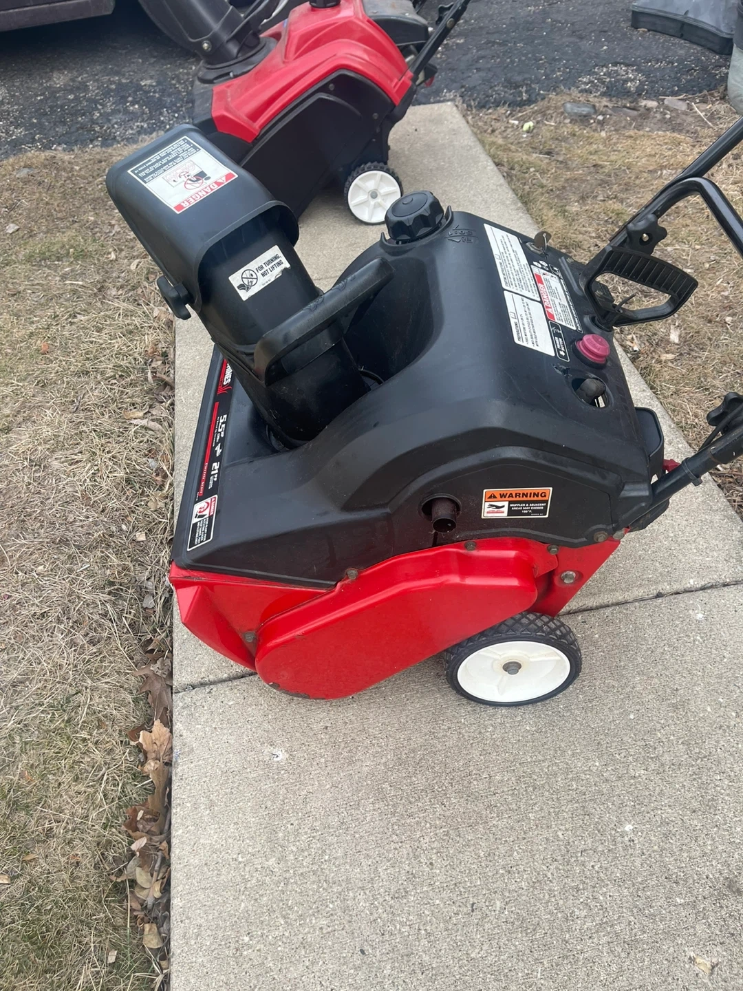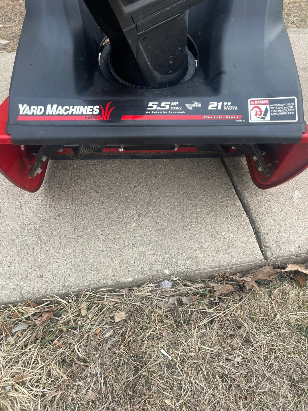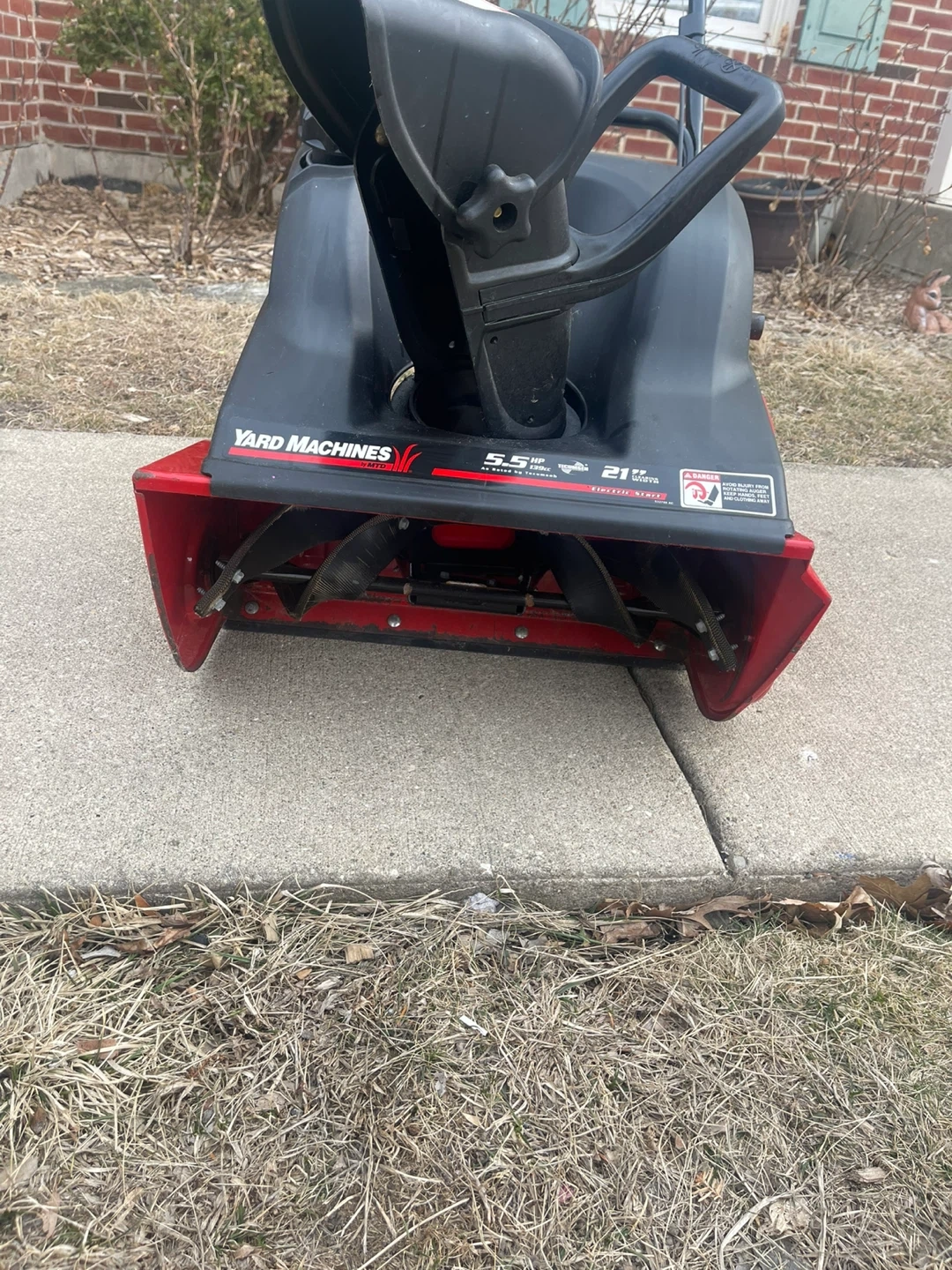 Yard Machines snow blower with a 5.5 HP engine and a 21" clearing width. It features an ELECTRIC PUSH BUTTON AUTOMATIC STARTER for easy operation. I installed a brand new spark plug in October of 2025. This snow blower is ready to go Folds down nice and easy for transport or storage. I have 3 now so One has to go