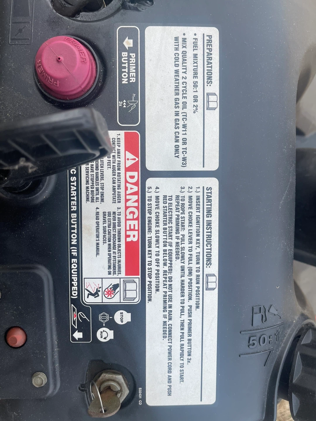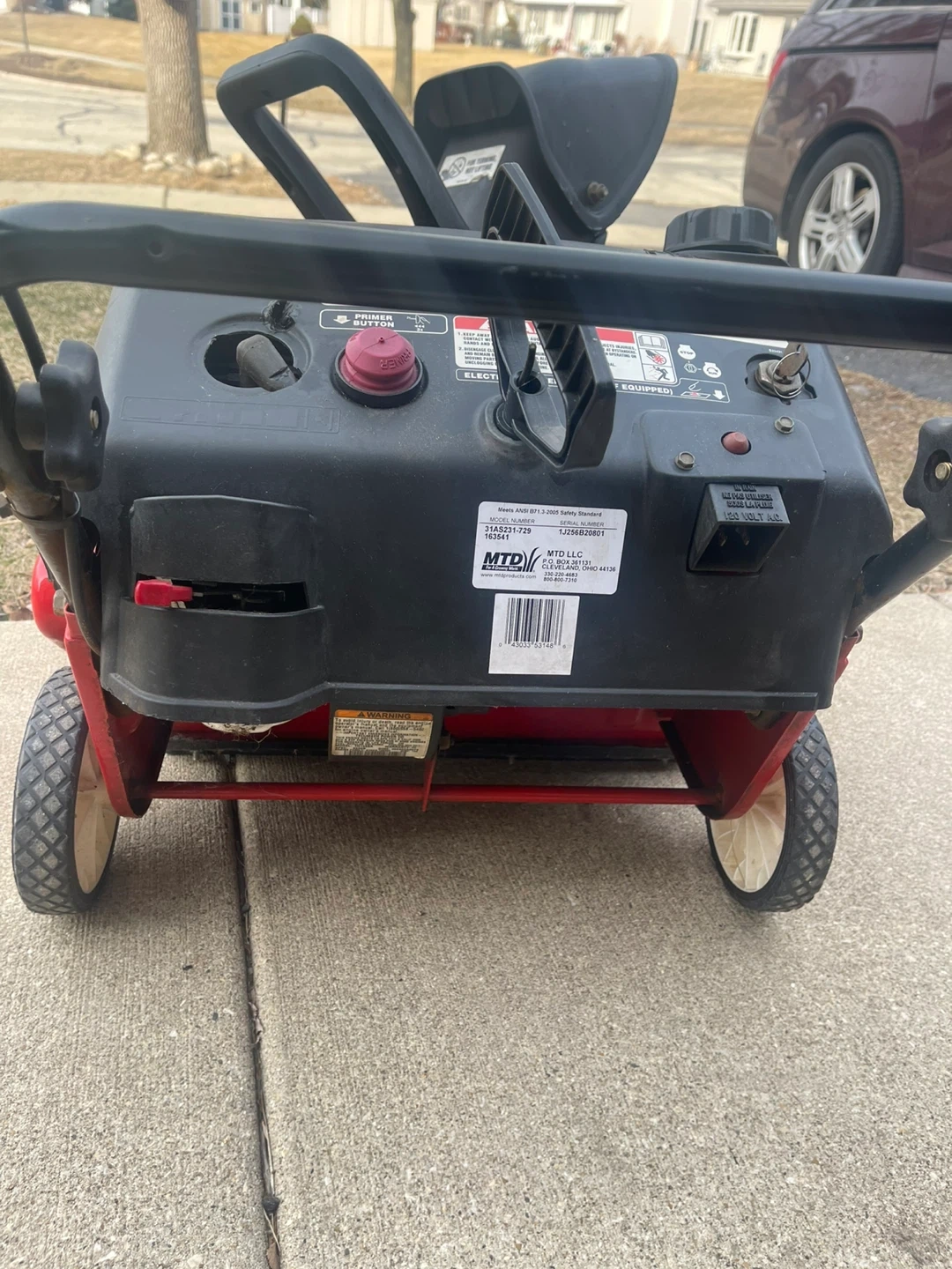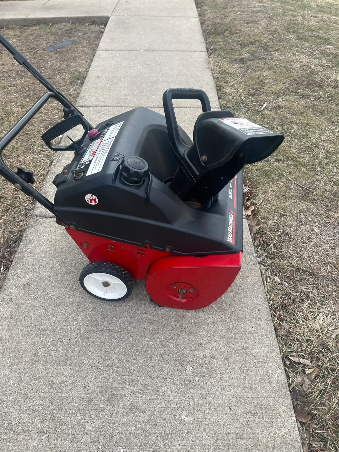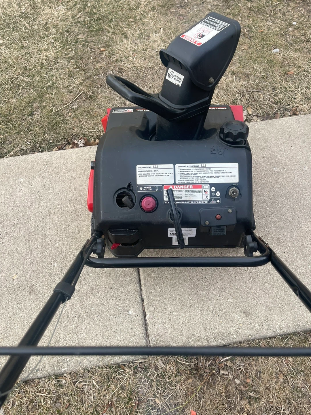 Yard Machines snow blower with a 5.5 HP engine and a 21" clearing width. It features an ELECTRIC PUSH BUTTON AUTOMATIC STARTER for easy operation. I installed a brand new spark plug in October of 2025. This snow blower is ready to go Folds down nice and easy for transport or storage. I have 3 now so One has to go