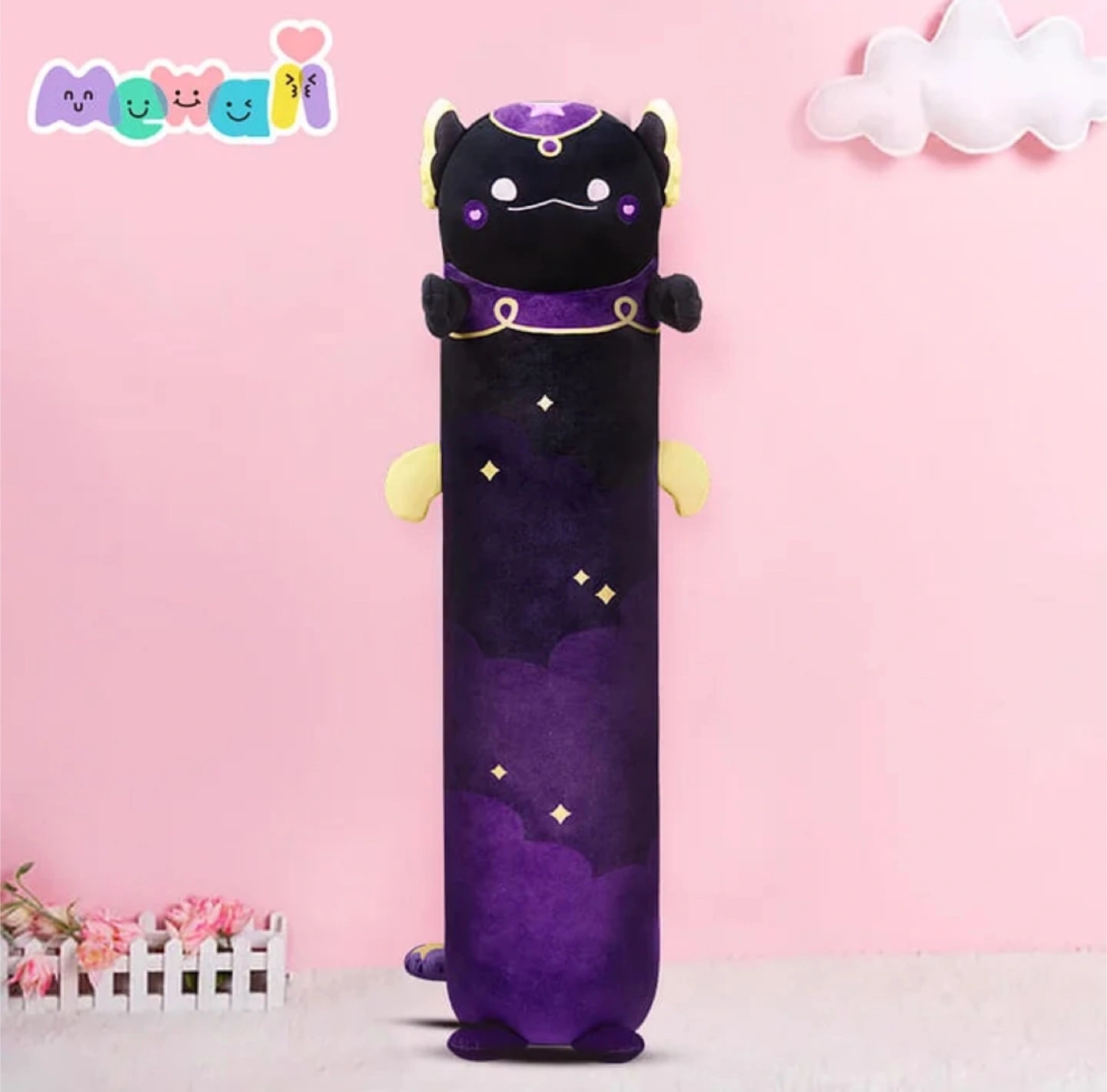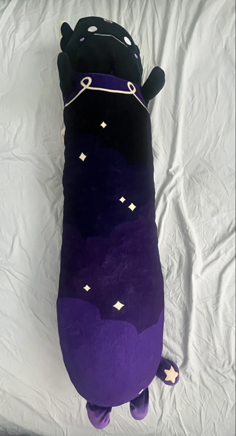 Plush body pillow. Purple and black. Cute axolotl design. Starry night theme. Soft and cuddly. From looong 36 inch series.