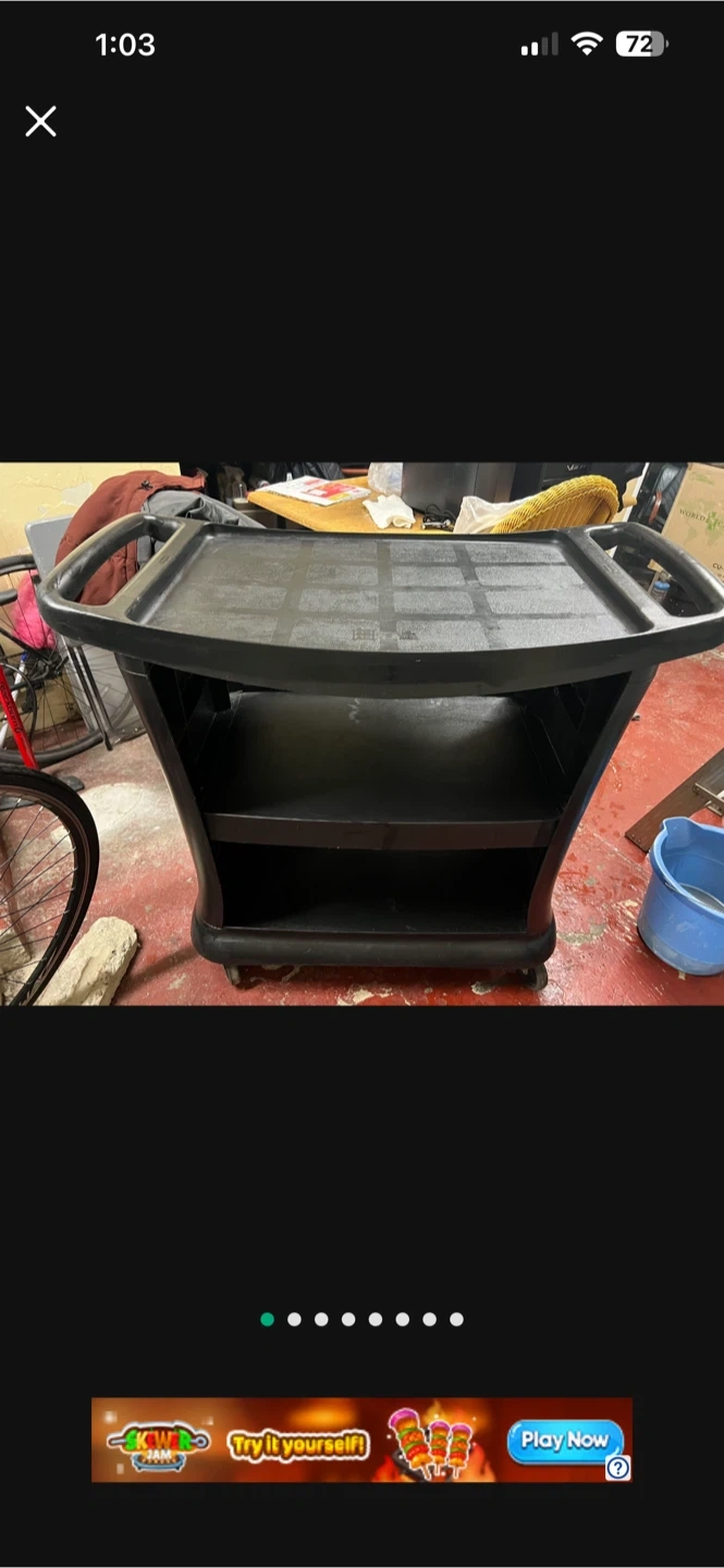 Selling a black utility cart with three shelves. It has a weight capacity of 300 lbs. The top surface measures approximately 18 inches in length.