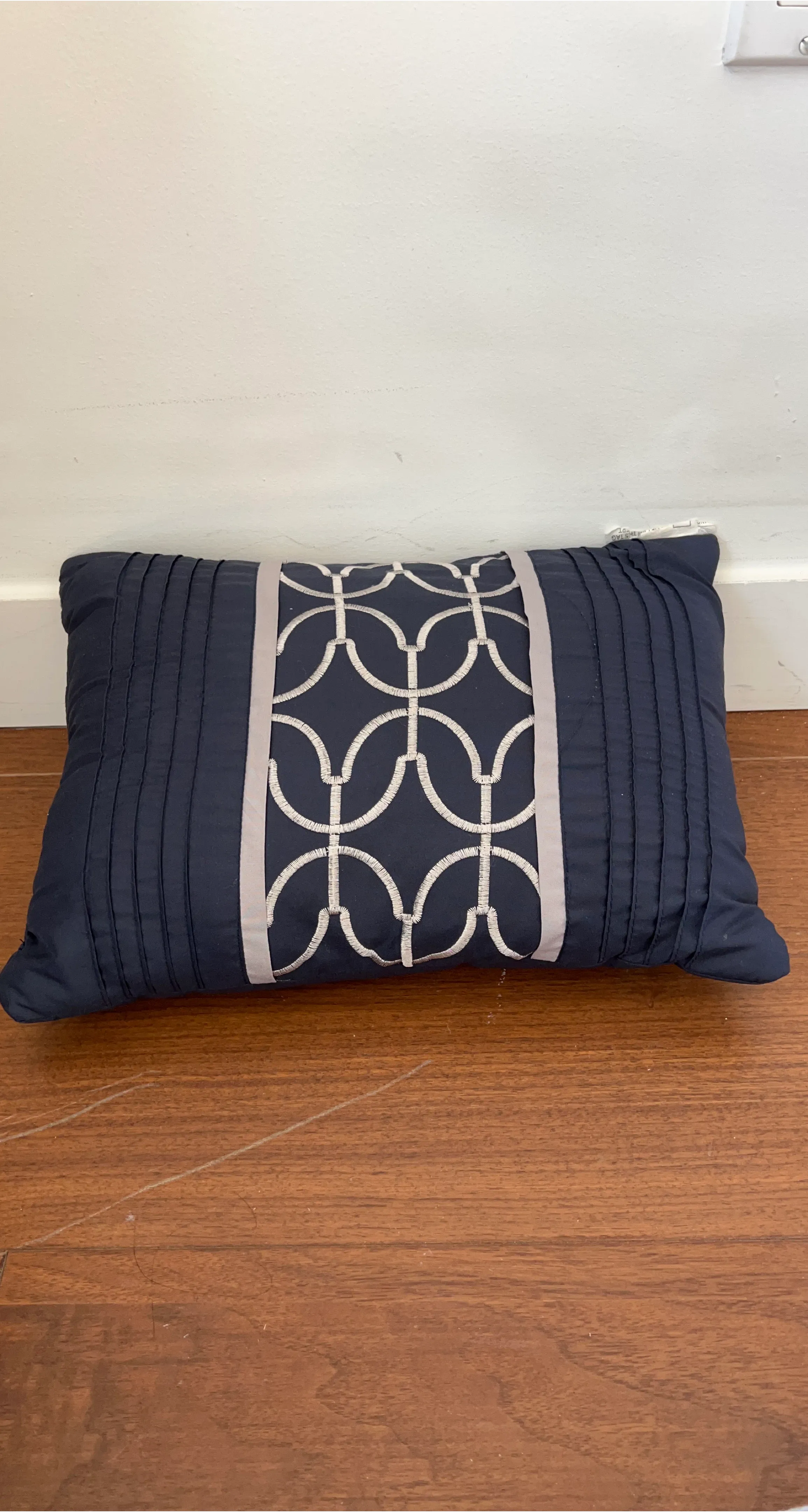 A lovely navy blue throw pillow. It features a decorative geometric pattern in white and silver on a central panel. The sides have a stylish pleated design. It's a beautiful accent for any sofa or chair!
