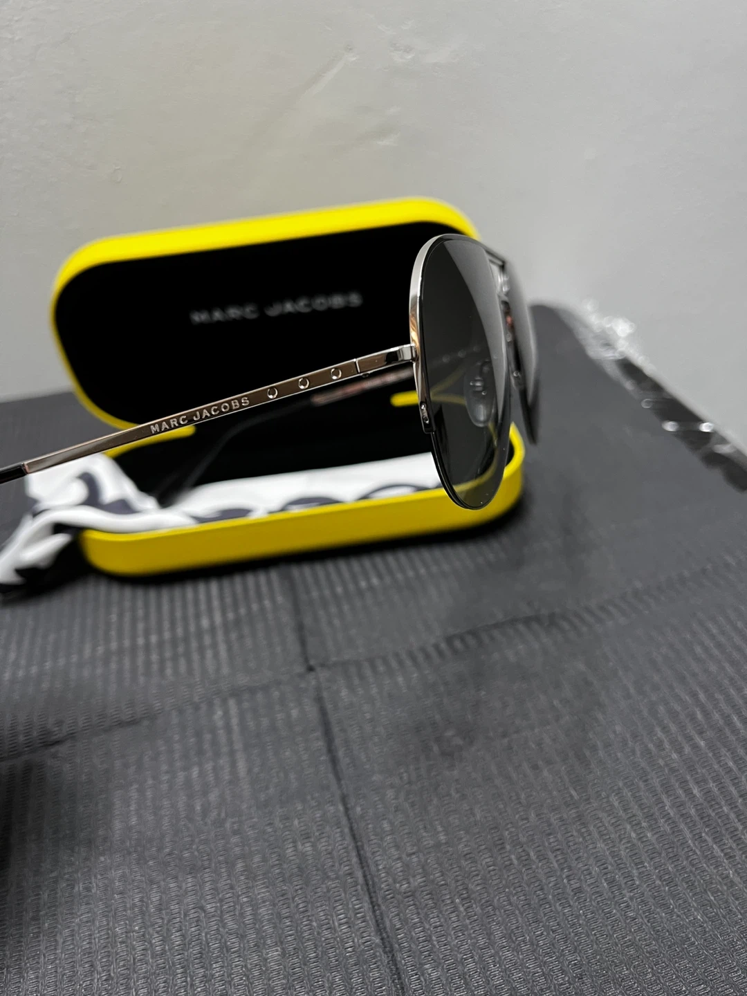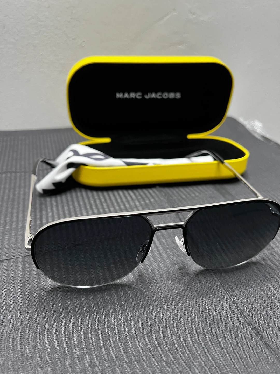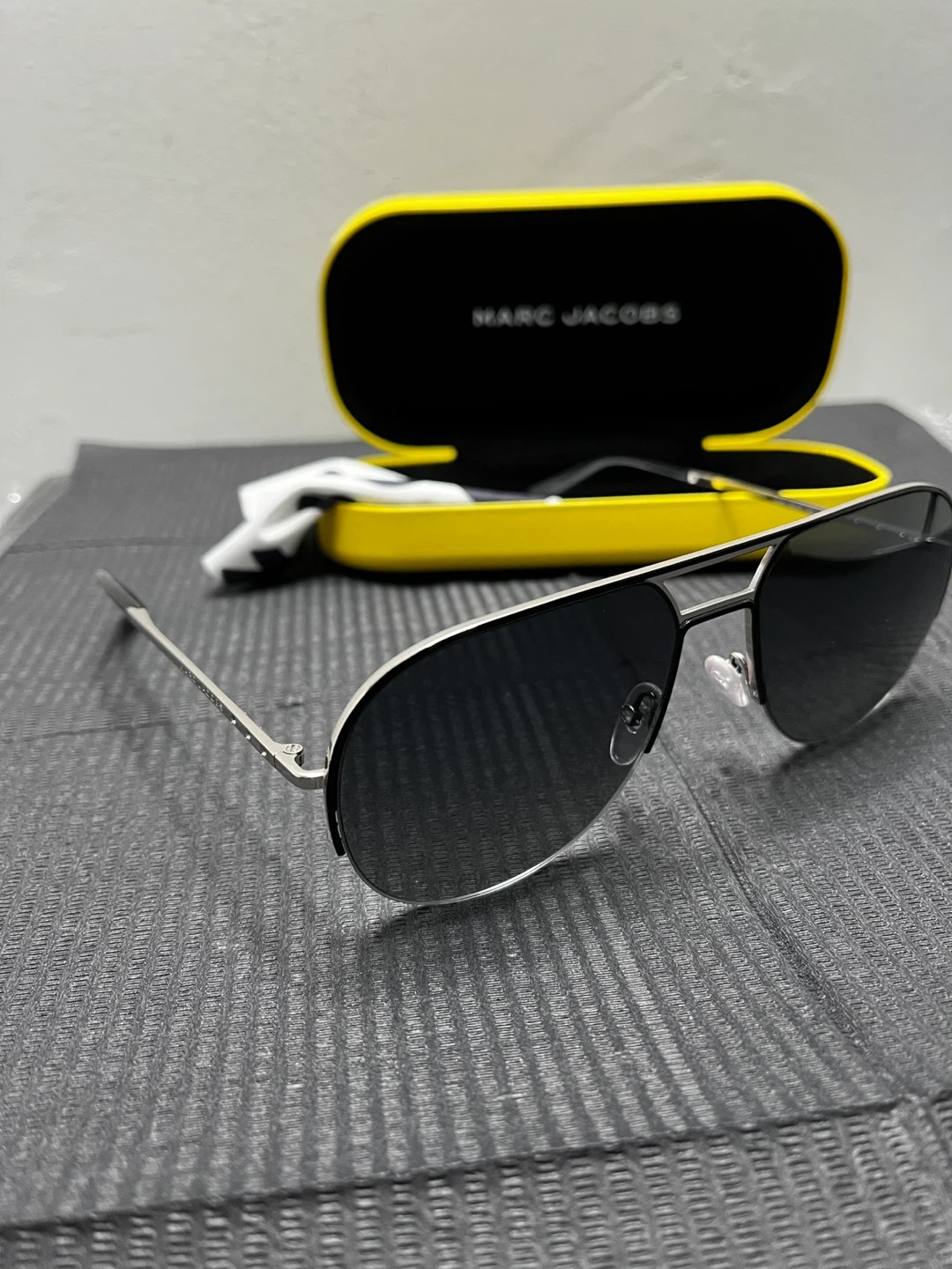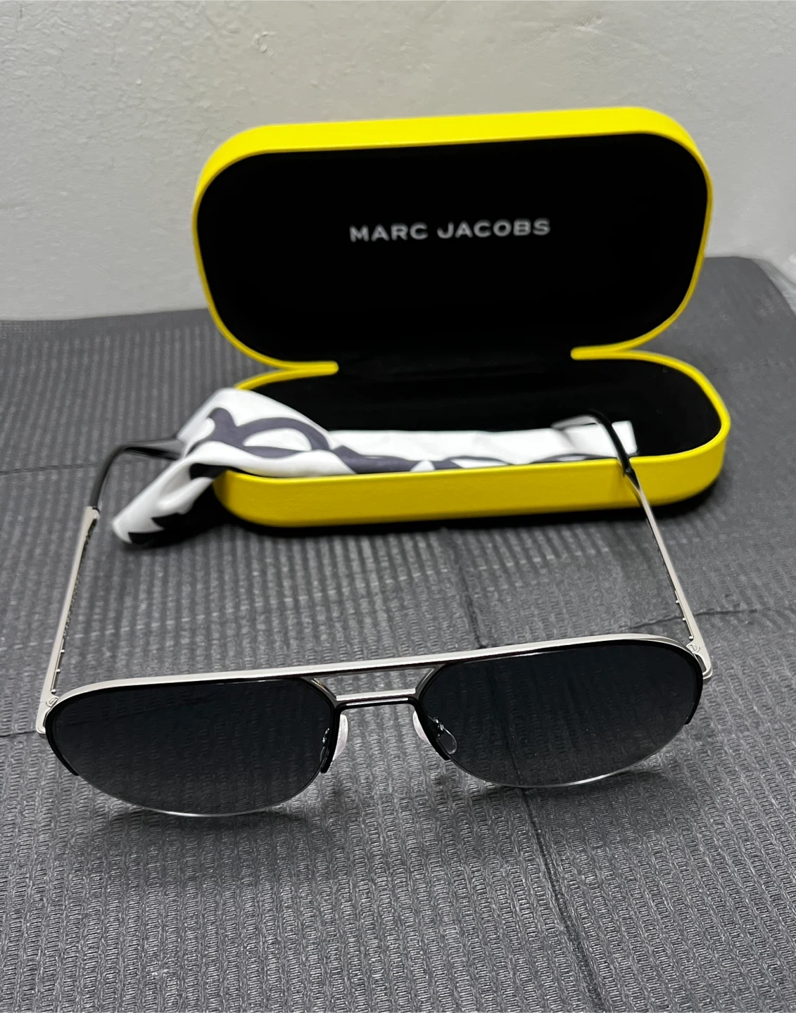 Classic aviator sunglasses from Marc Jacobs. They feature a silver-tone metal frame and dark tinted lenses. Includes the original yellow case and cleaning cloth. A stylish accessory for everyday wear!