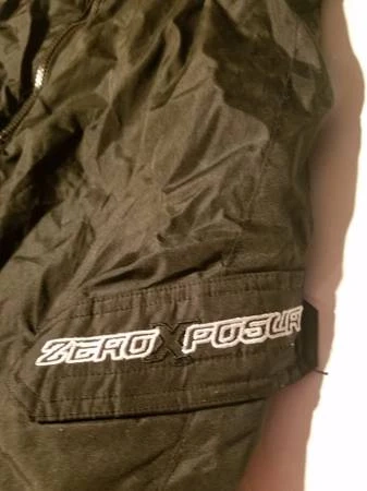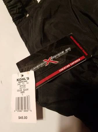 Zero Exposure snow bib in size L. It's black and looks to be in great condition. The tag shows a style number of 346 10 14 and the original price was $45