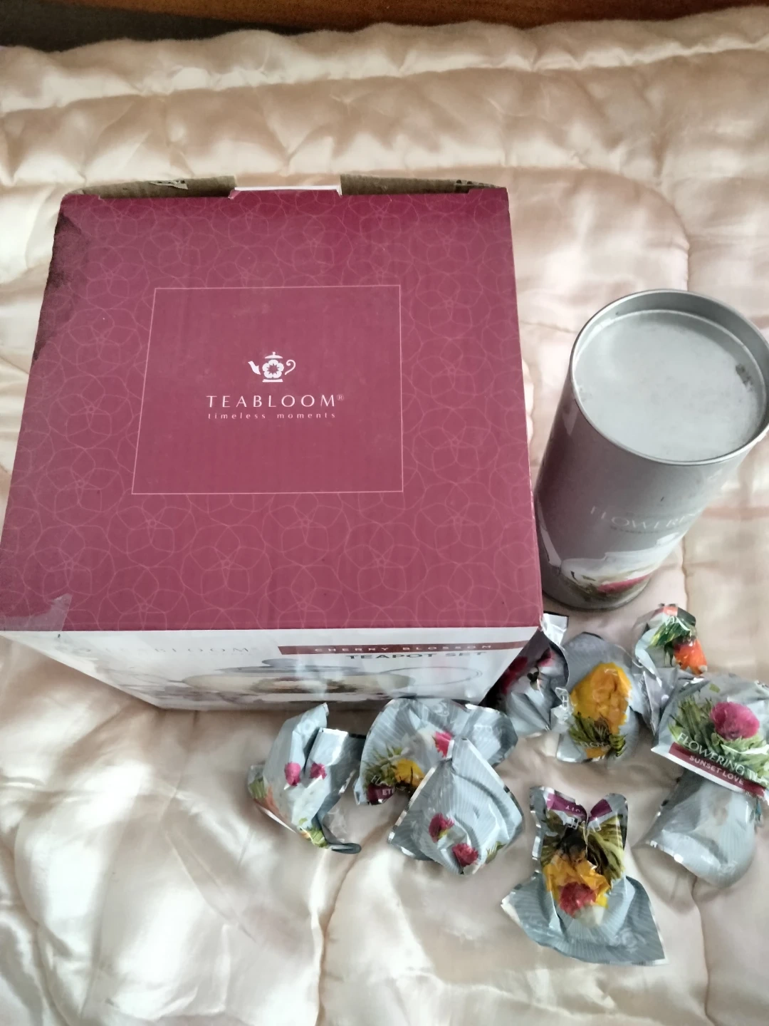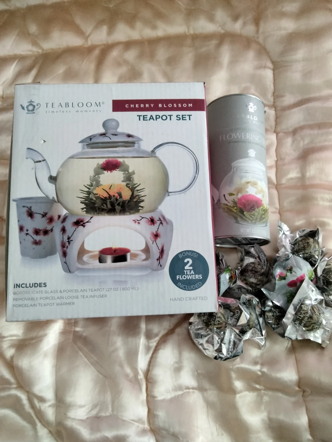 This Teabloom Cherry Blossom Teapot Set includes a glass and porcelain teapot (27 oz / 800 ml) with a removable loose tea infuser and a porcelain tea warmer. It also comes with 2 tea flowers. It's hand crafted! I've also included canister with 12 Green Teas Flowers