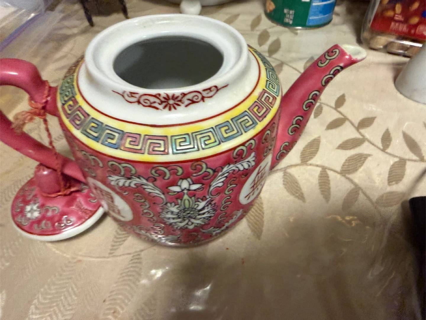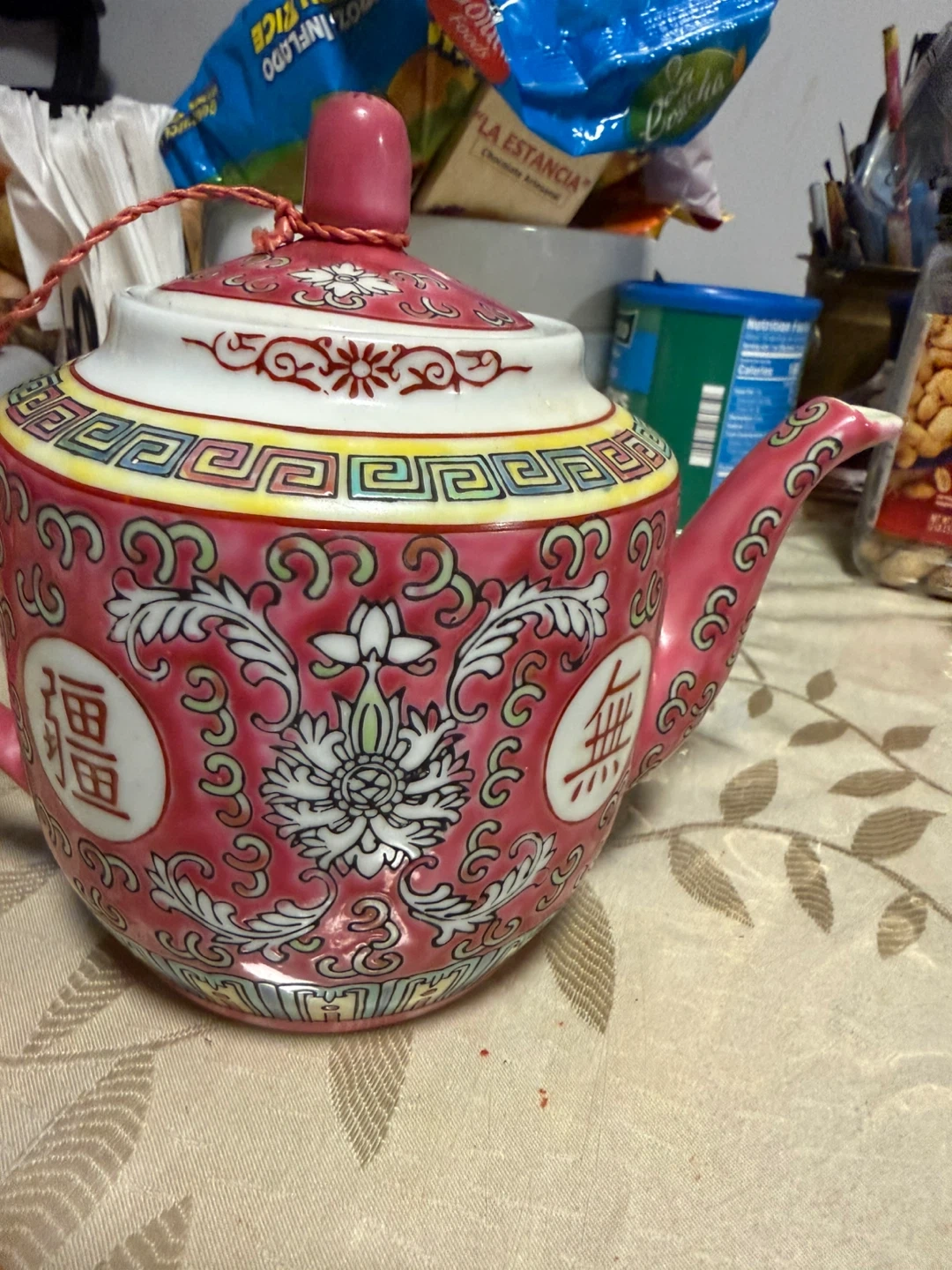 For 4 cups gift never used Beautiful pink ceramic teapot with intricate floral and scrollwork detailing. It features a white lid with a pink knob and a traditional spout and handle. The decorative pattern includes Chinese characters and a Greek key border. This teapot adds a touch of elegance to any tea setting!