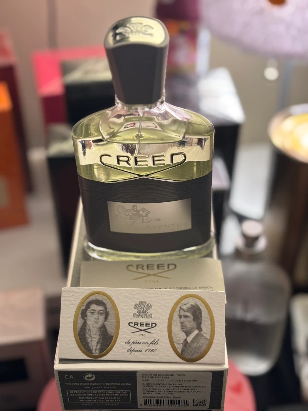 Creed Aventus cologne, 100ml bottle of Eau de Parfum. This fragrance contains alcohol, parfum, aqua, limonene, linalool, citronellol, alpha-isomethyl ionone, and benzyl salicylate. Made in France.