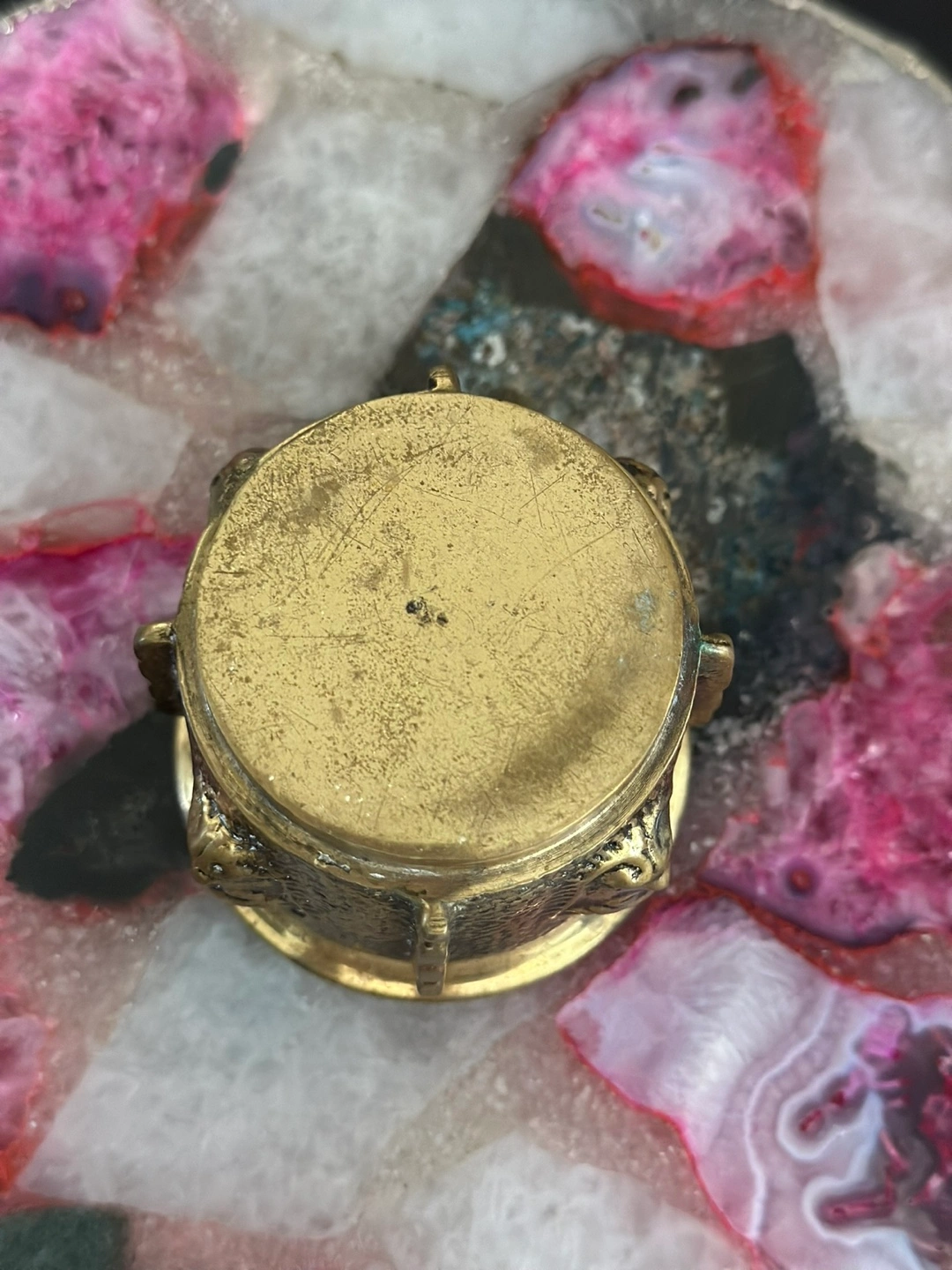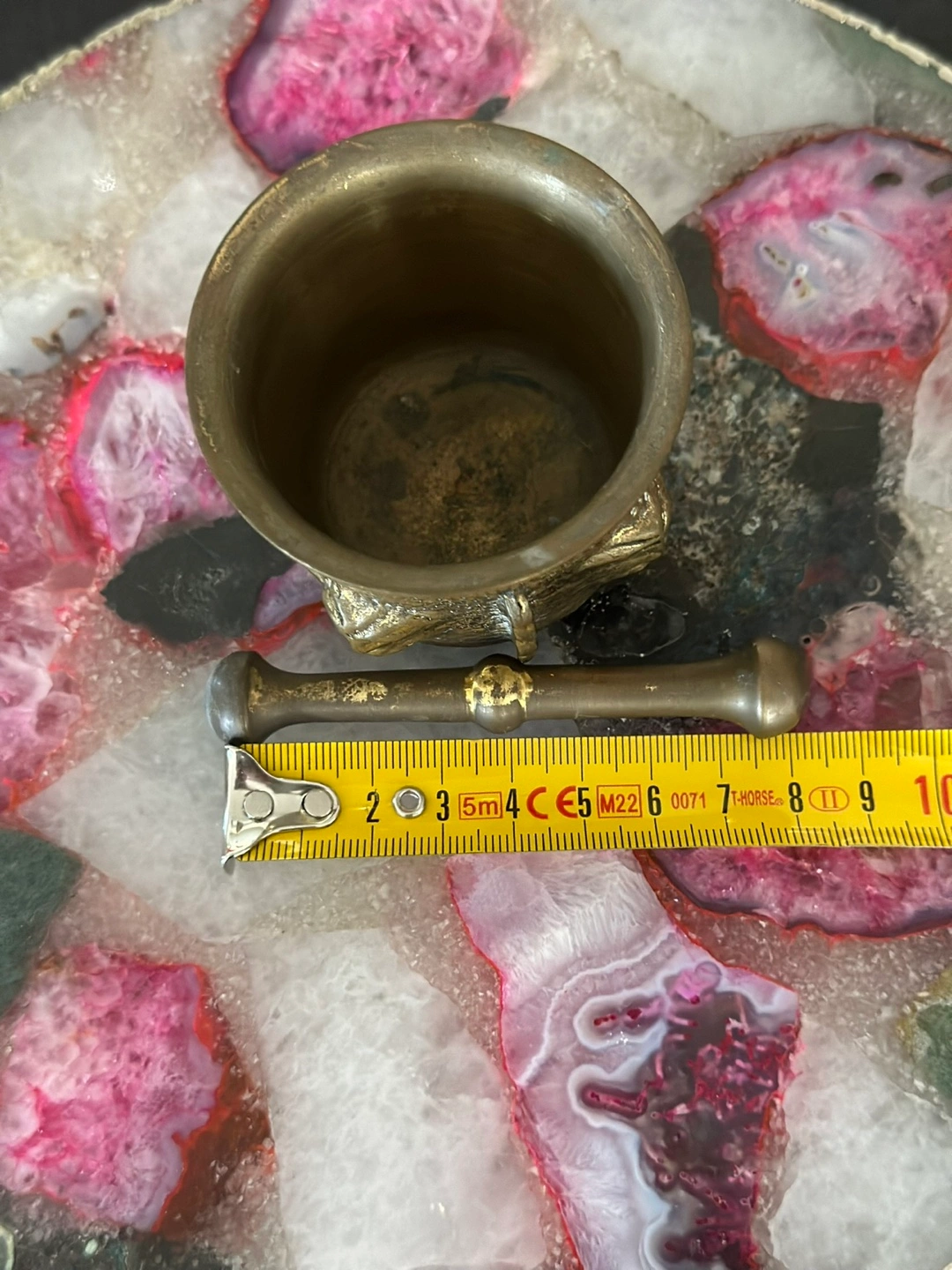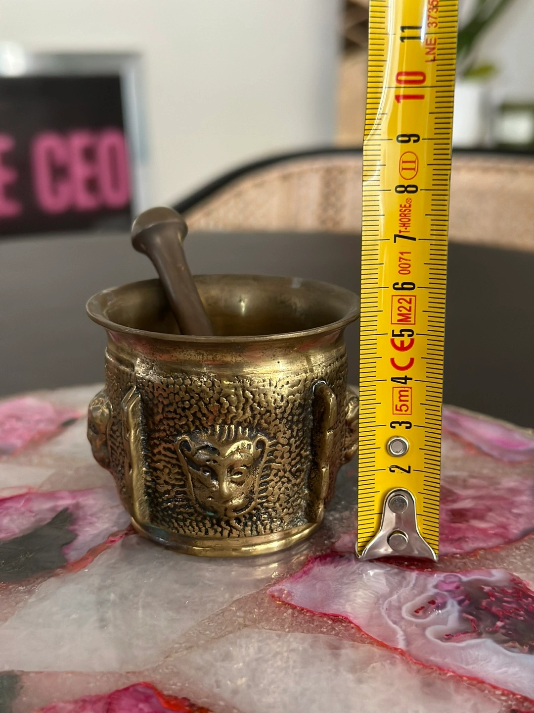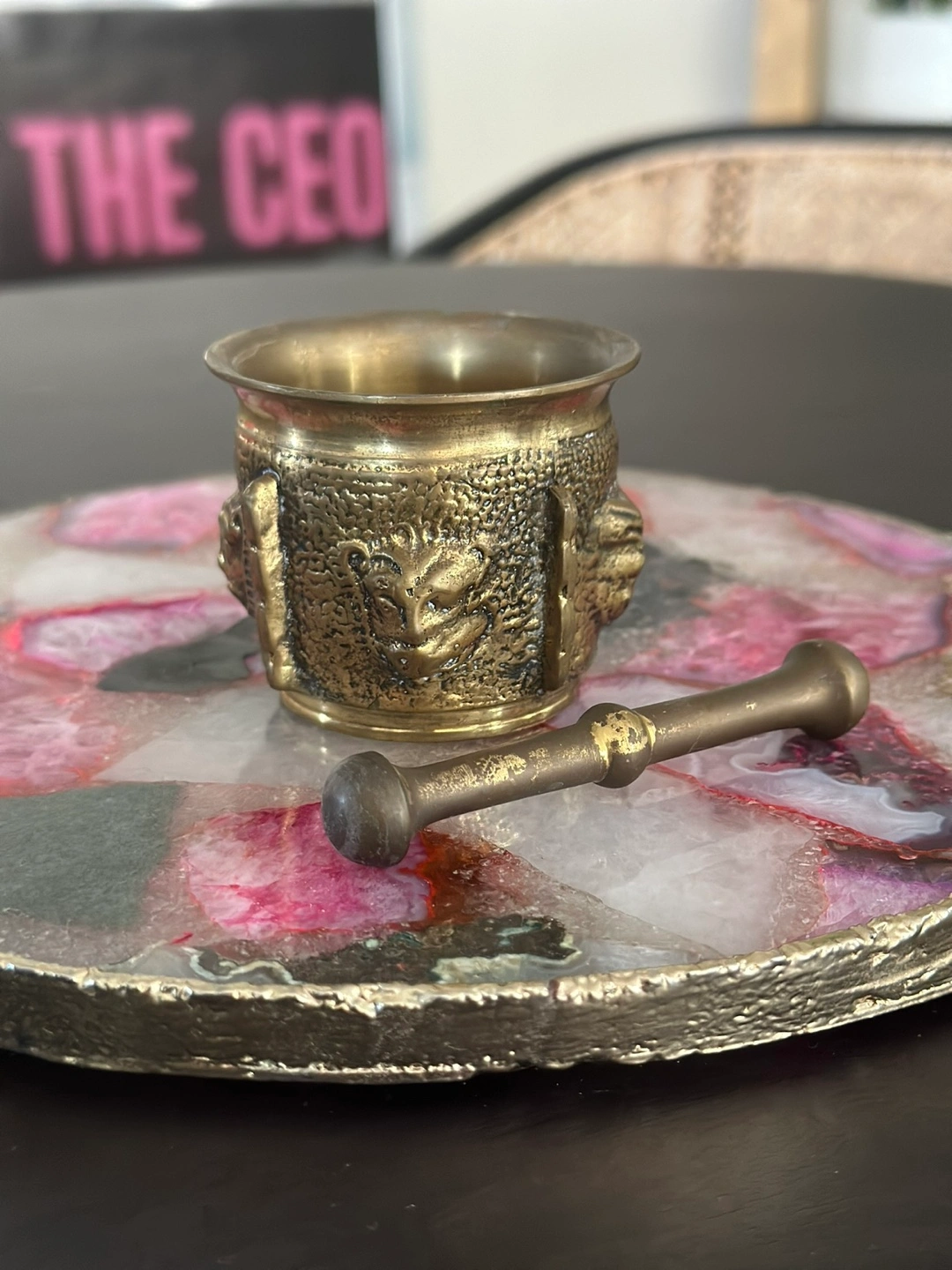 This solid brass mortar & pestle features twin lion head motifs cast into the sides — a symbol of strength, heritage, and timeless craftsmanship. Small but weighty, it grinds herbs and spices with satisfying precision while doubling as a striking display piece for kitchens, shelves, or ritual-style spaces.