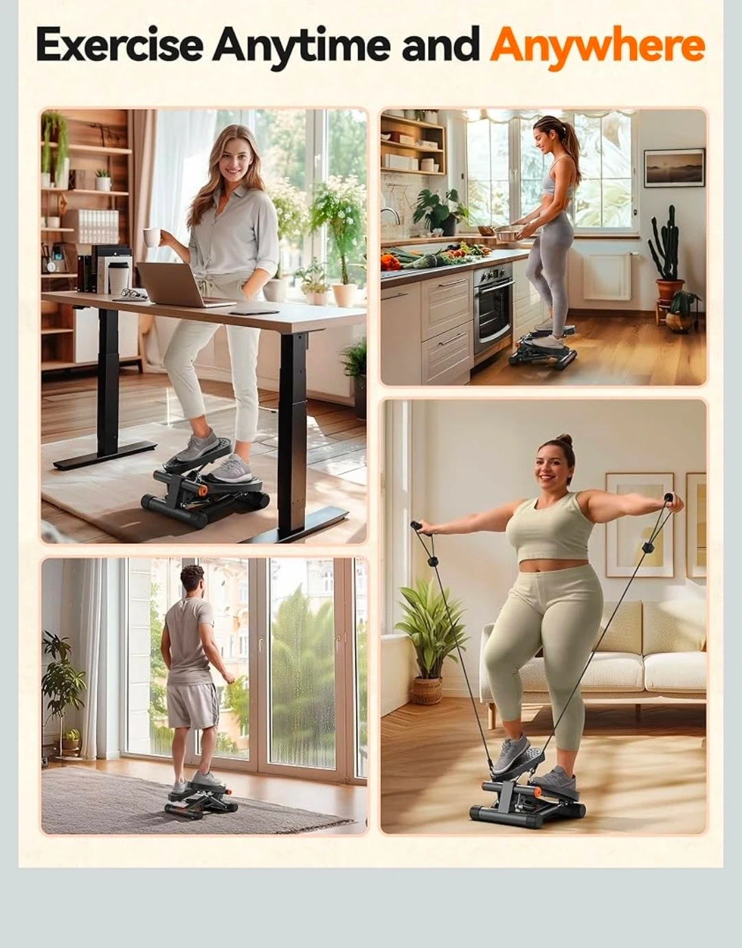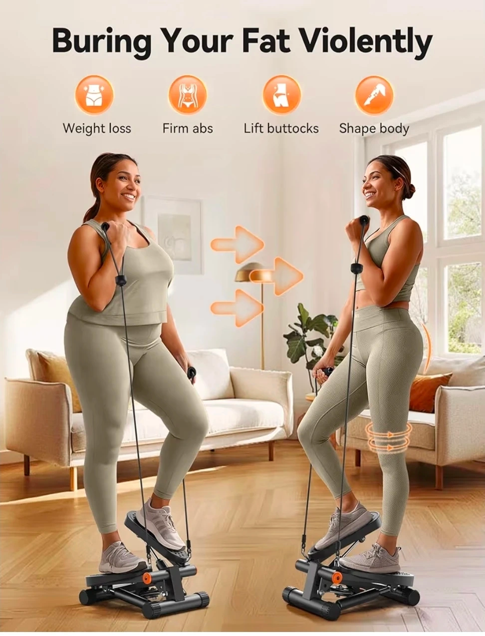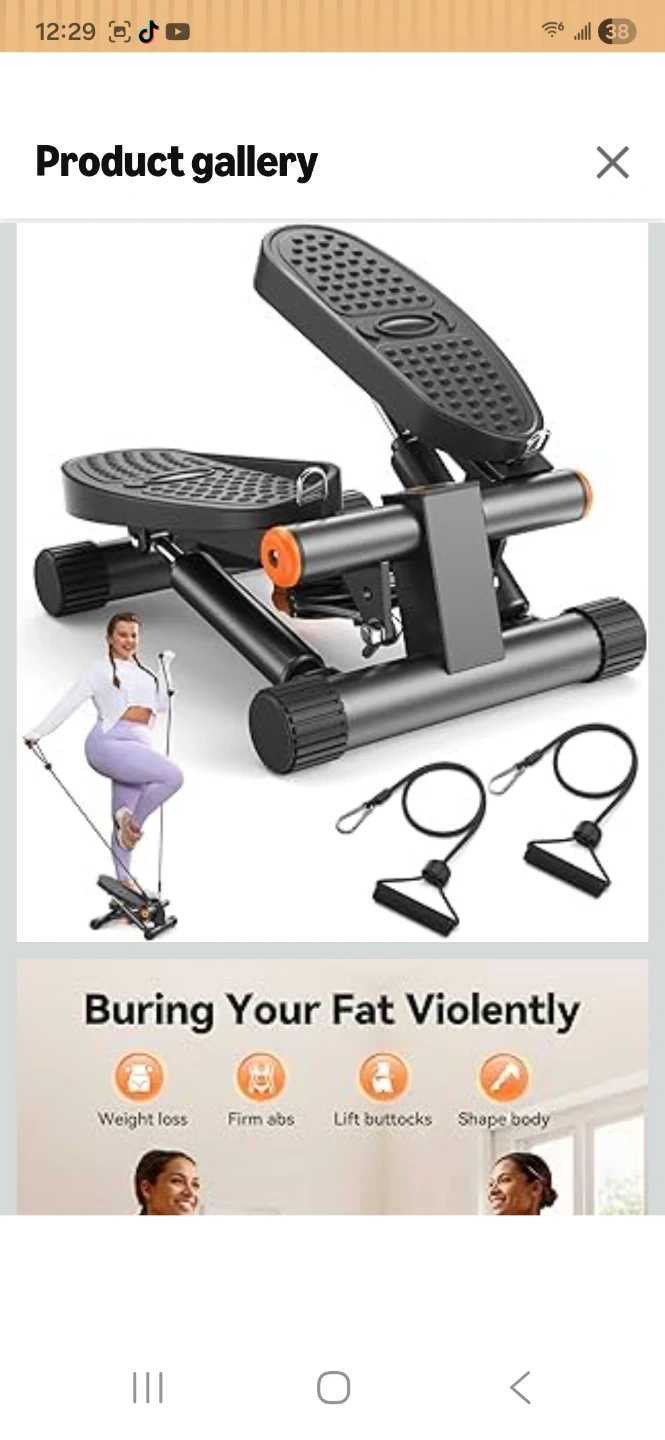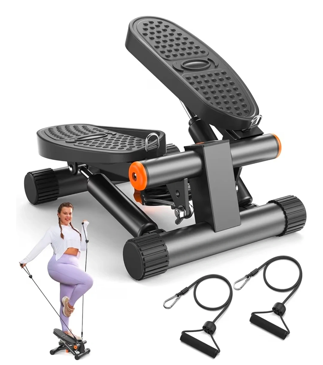 This mini stair stepper is designed for weight loss and muscle toning. It features a professional hydraulic rod for smooth operation and a silent silicone mat. It has a loading capacity of 300 lbs and includes resistance bands for a full-body workout.