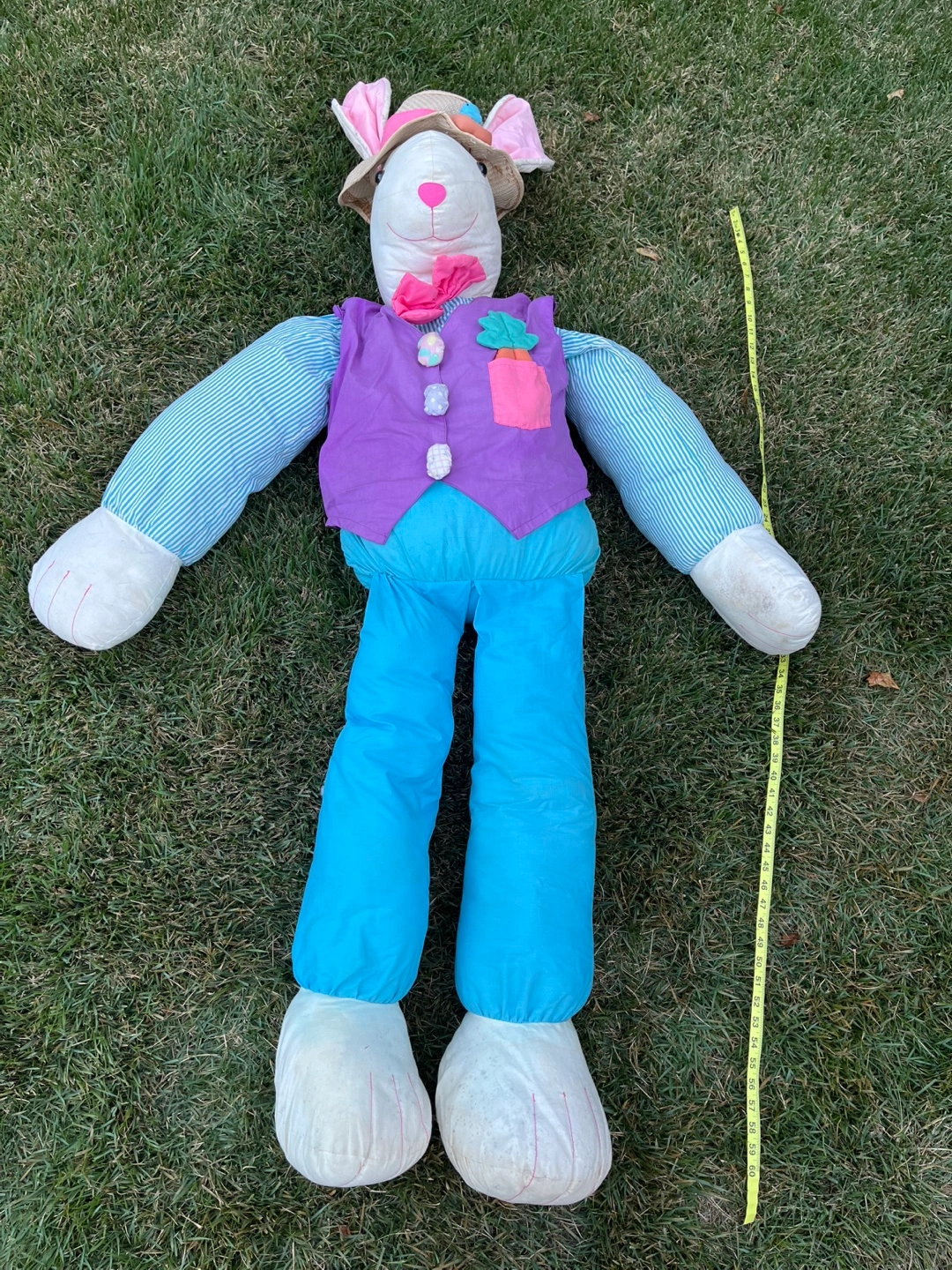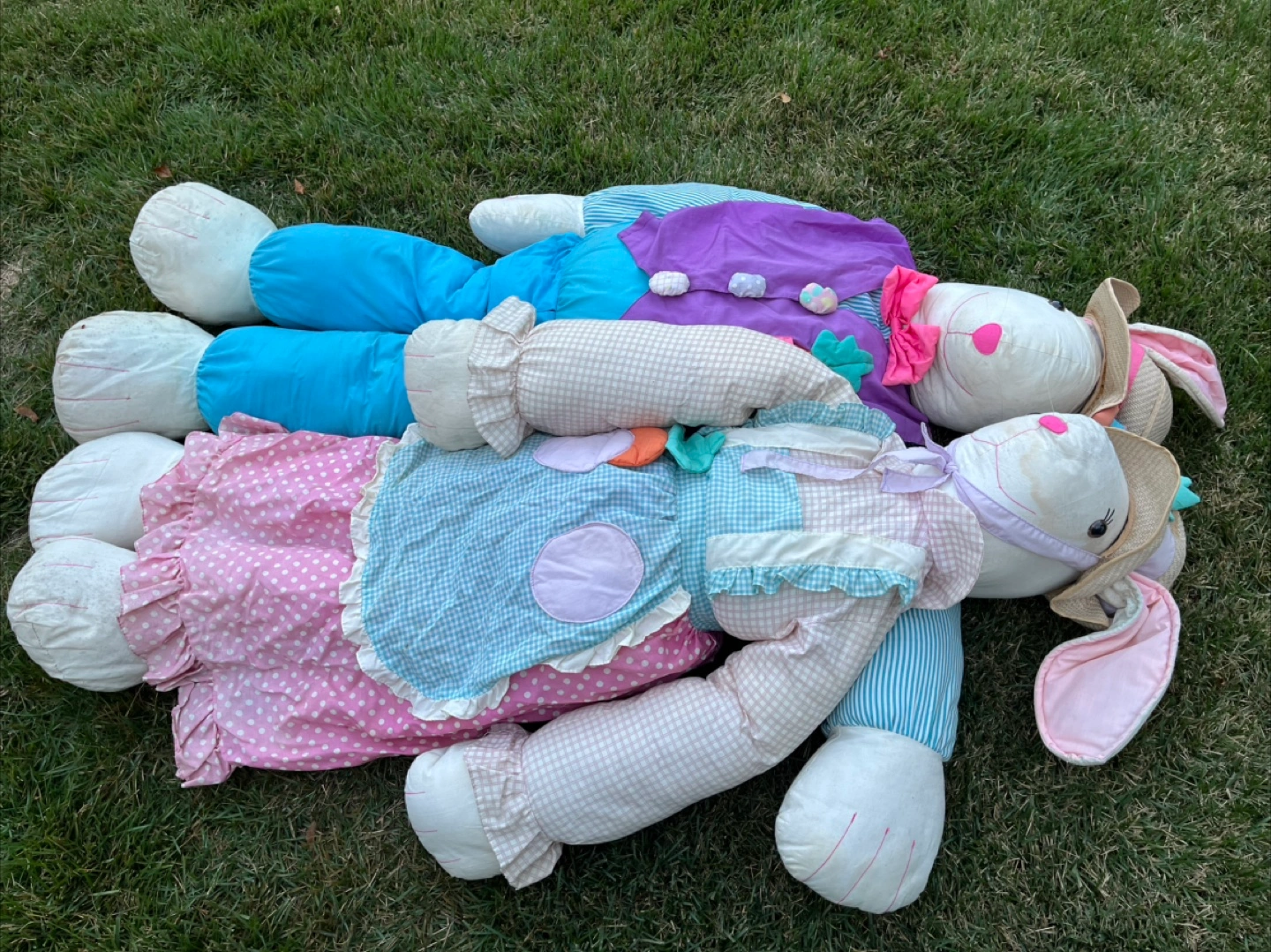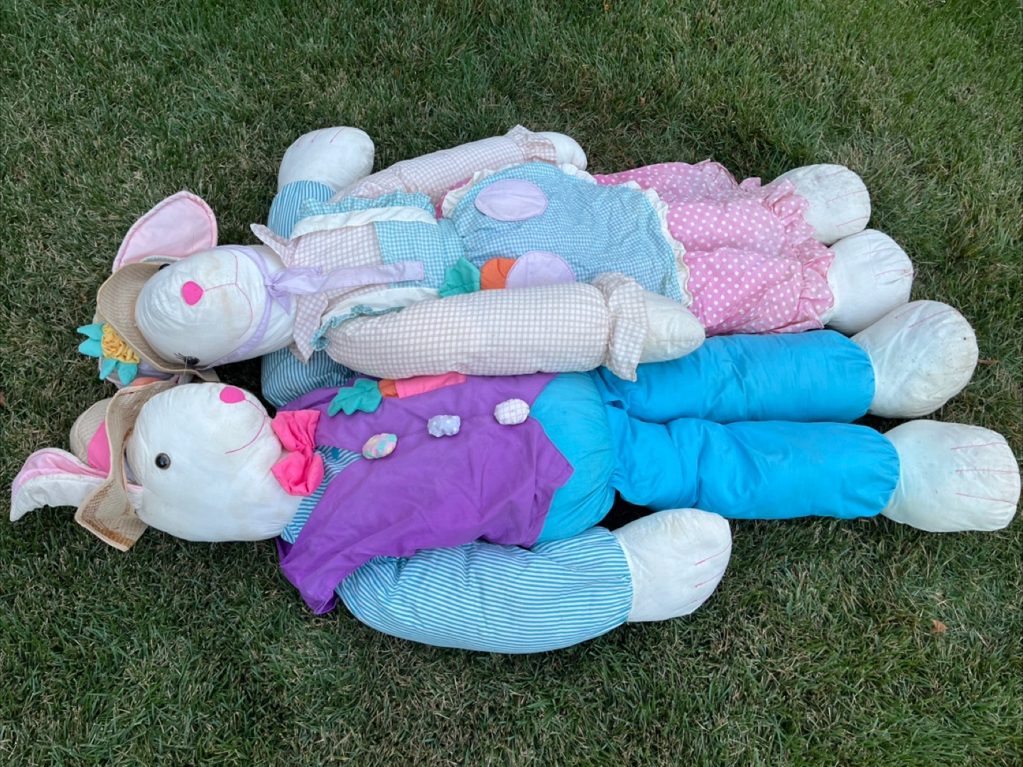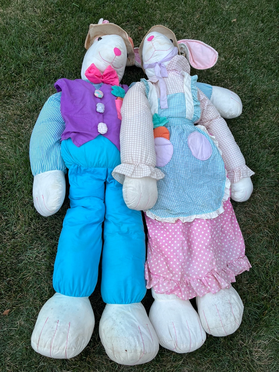 This pair of large Easter bunny stuffed animals is ready for spring decorating! One bunny wears a purple vest and blue pants, while the other sports a blue gingham apron and pink polka dot skirt. They're a fun, festive addition to any Easter celebration.