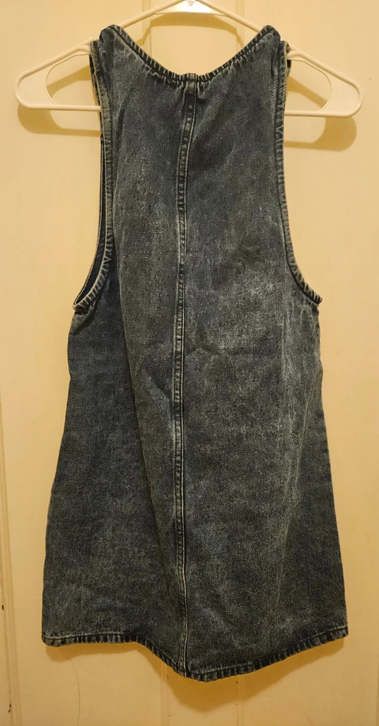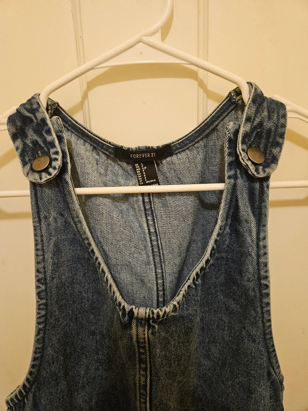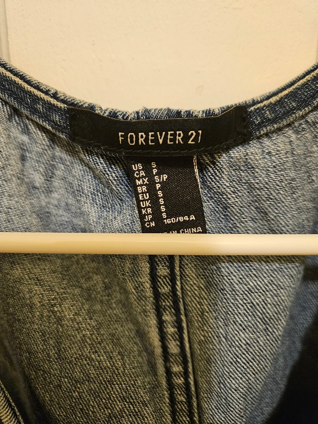Here's a cute denim dress from Forever 21! It's a size small. The material is 100% cotton, so it's super comfy. Machine wash cold and tumble dry low for easy care