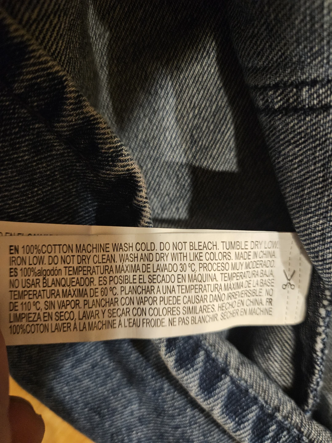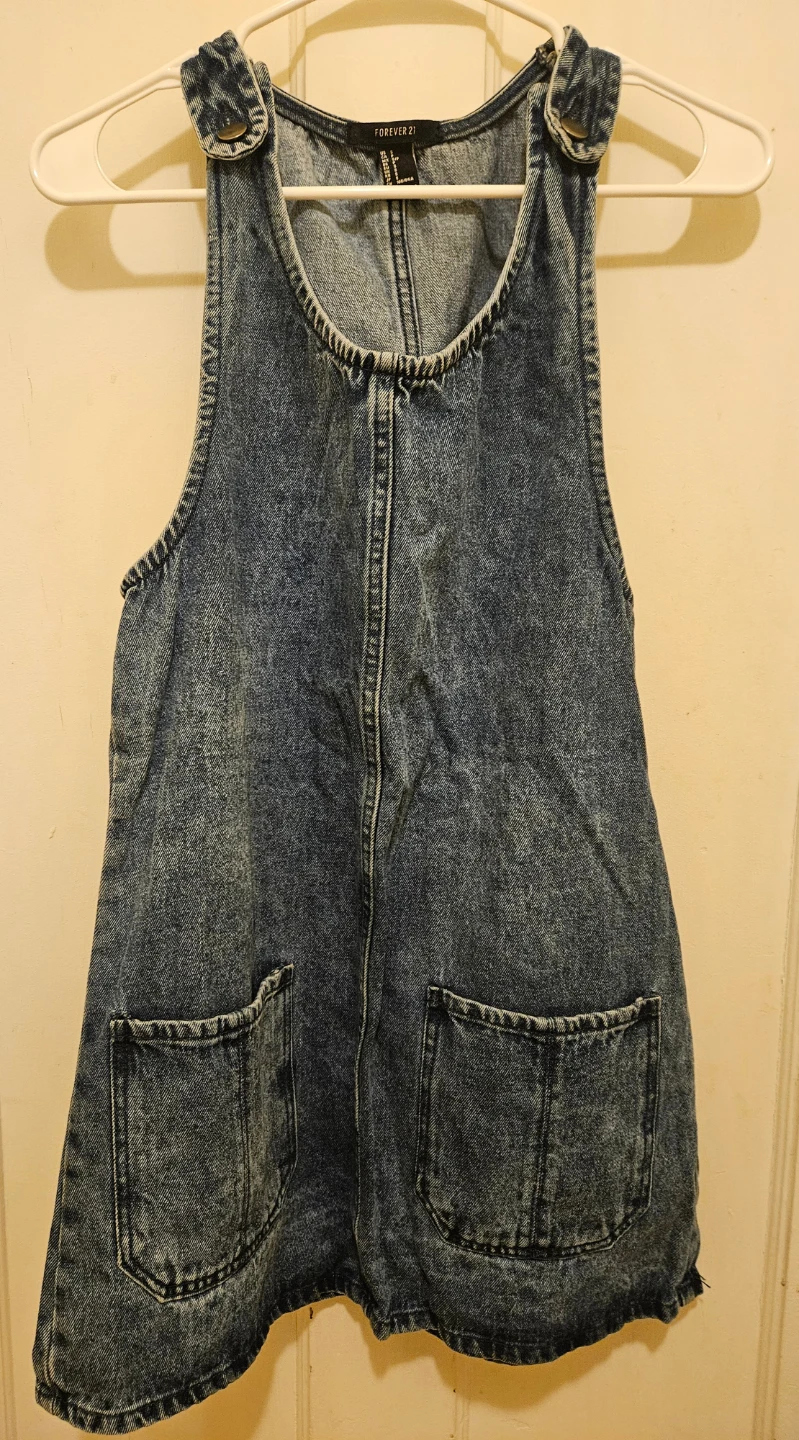 Here's a cute denim dress from Forever 21! It's a size small. The material is 100% cotton, so it's super comfy. Machine wash cold and tumble dry low for easy care
