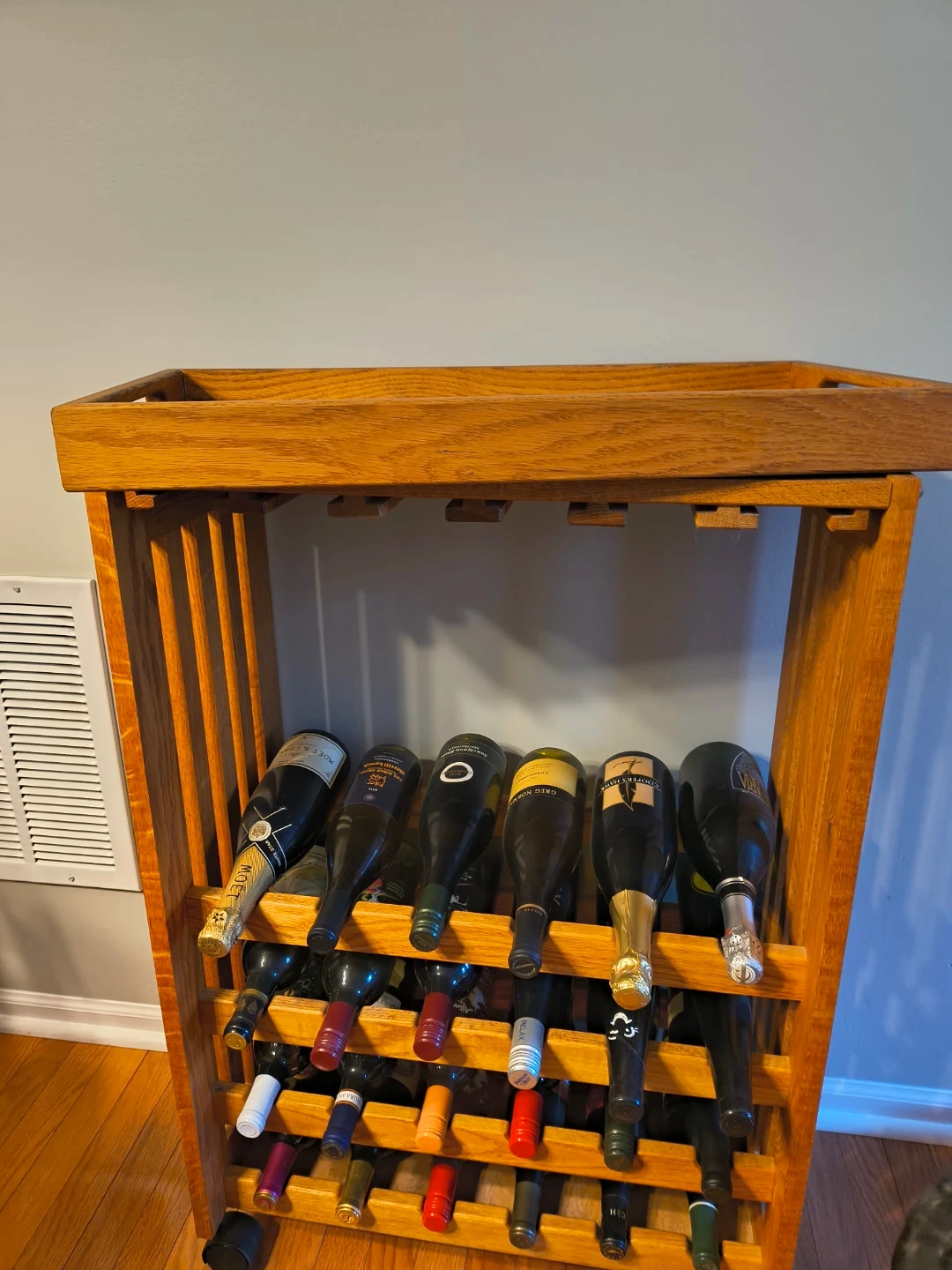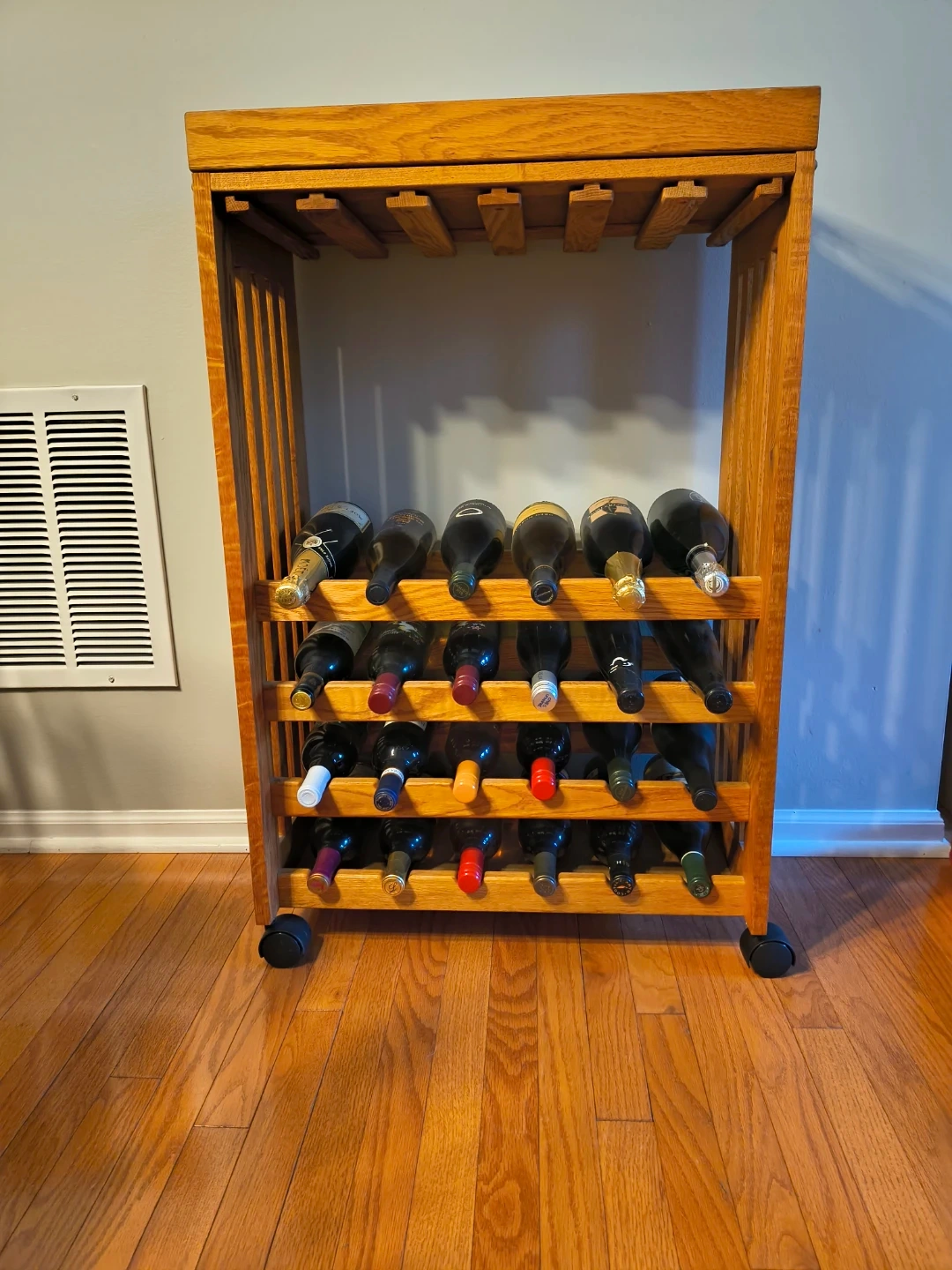 This sturdy wooden wine rack holds up to 24 bottles. It's made of teak and includes wheels for easy mobility. It will also hold wine glasses. The top is removable and can be used as a serving tray.