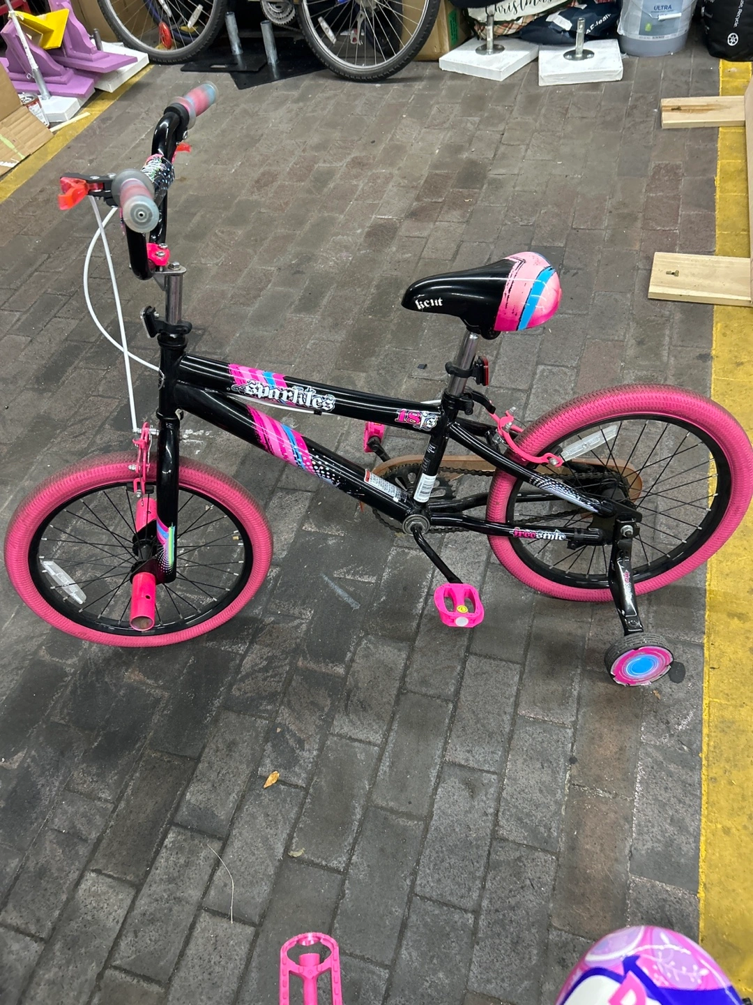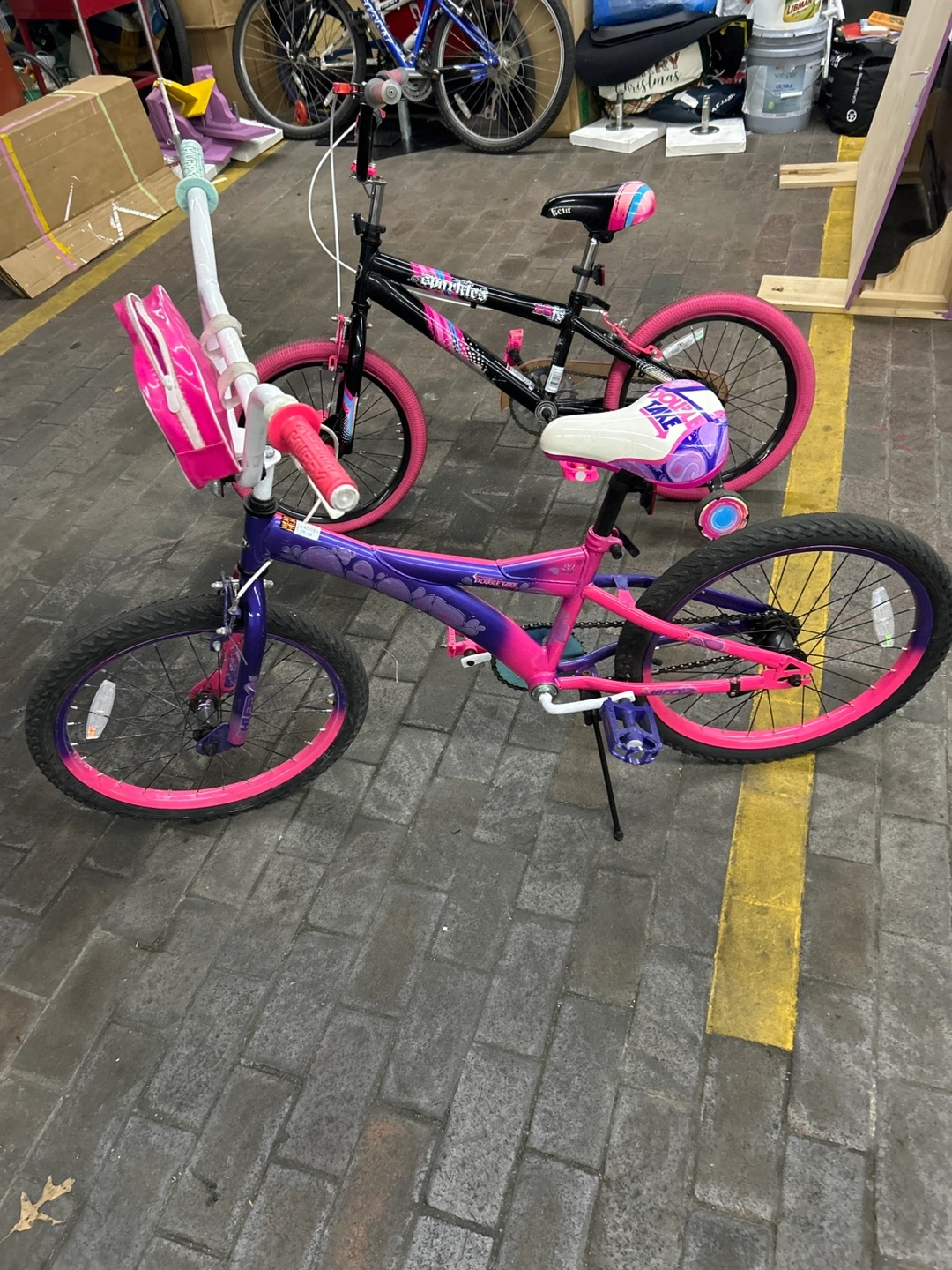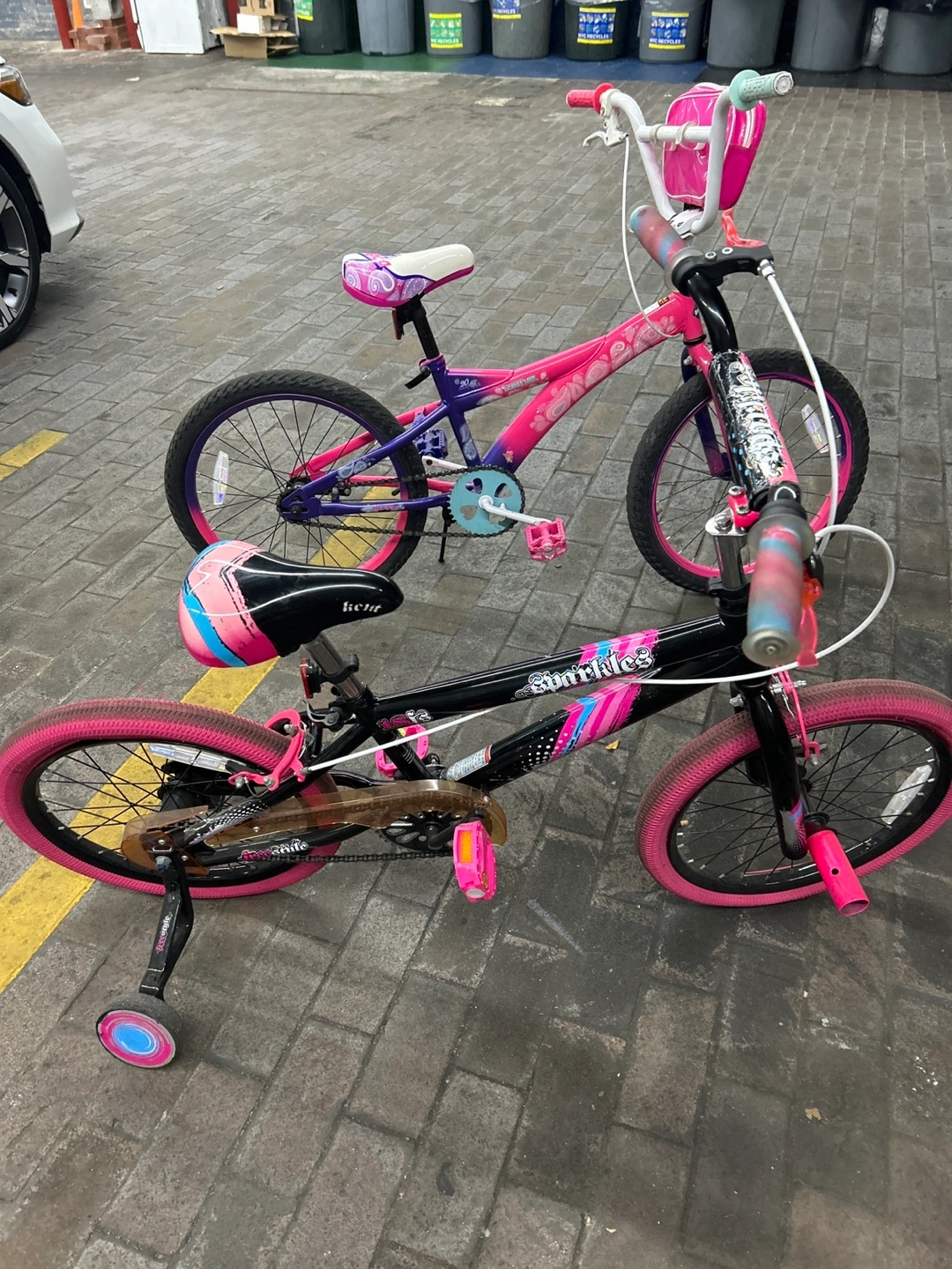 Two cute kids' bikes! One is a 'Sparkles' bike in purple and pink, and the other is a 'SunRides' bike in black and pink. Both are in good condition and ready for a new rider