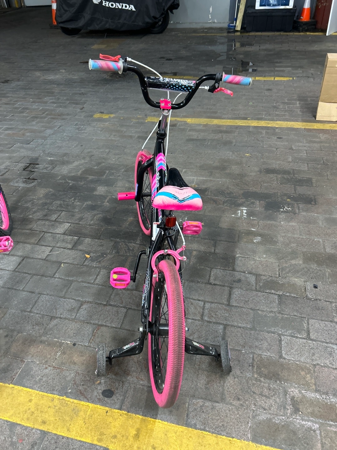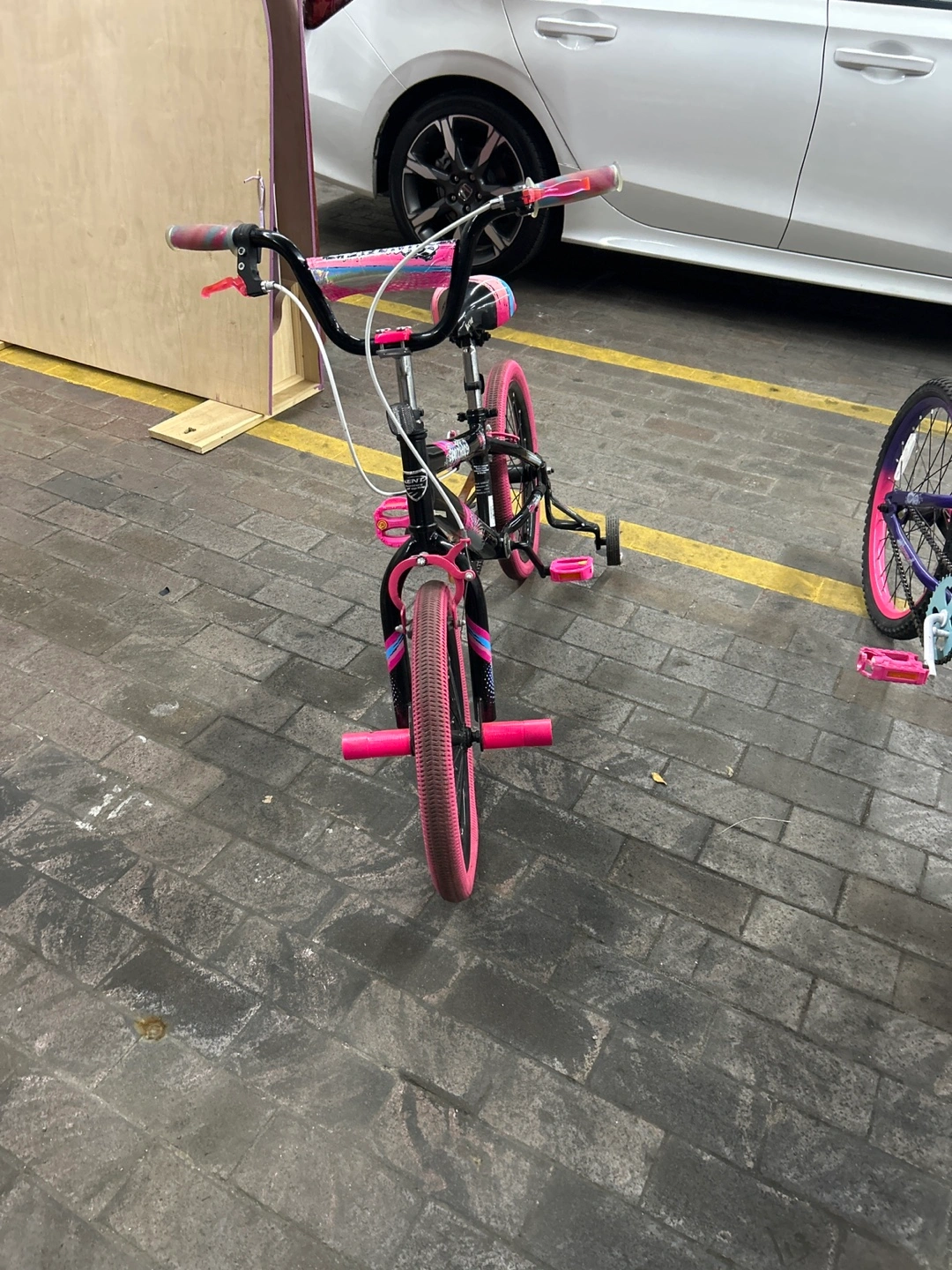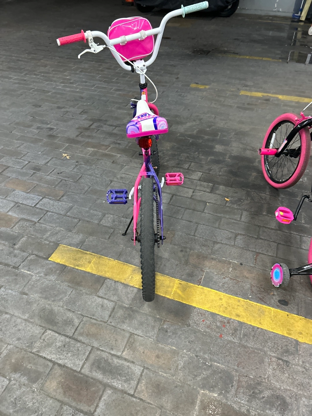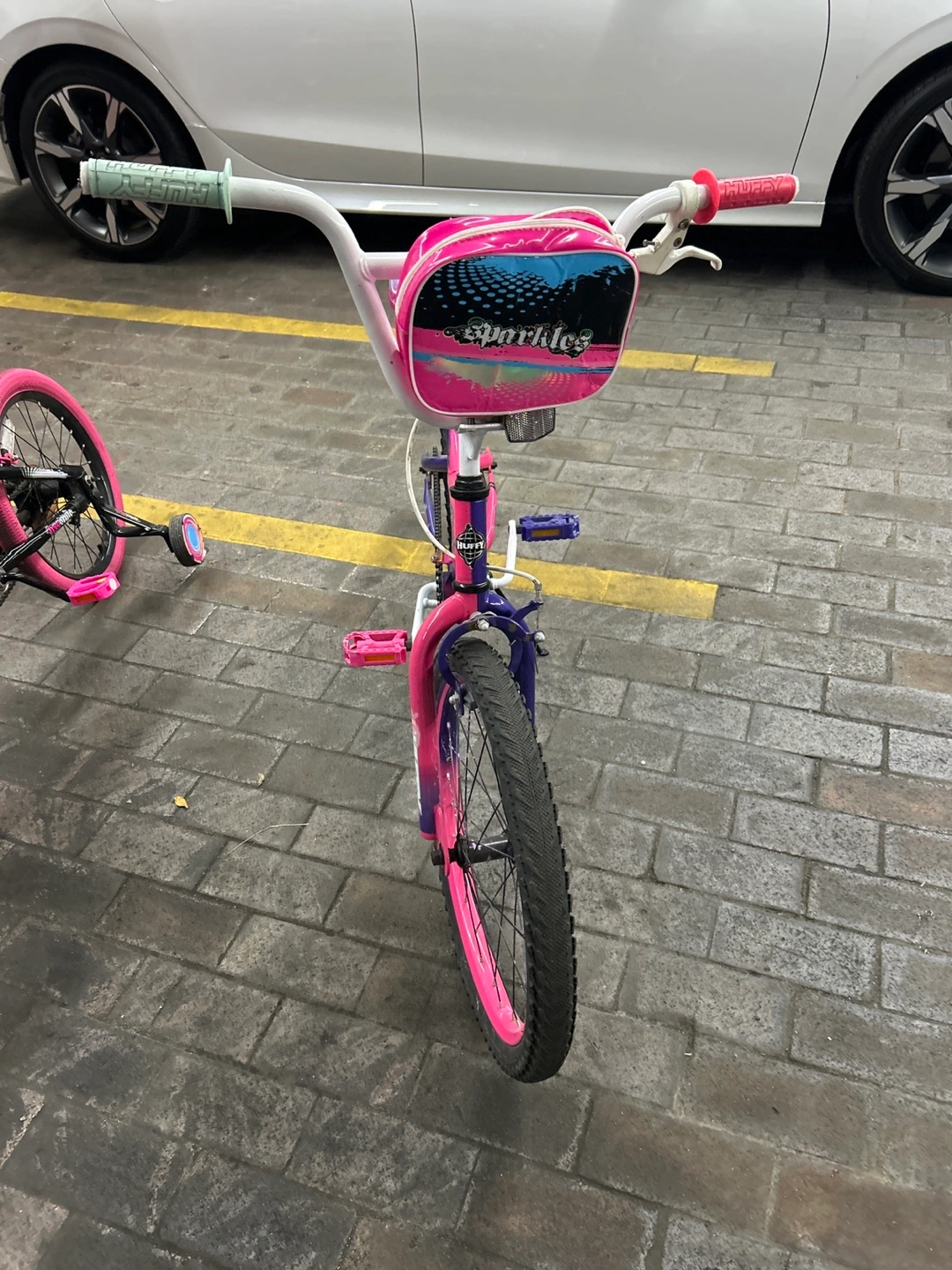 Two cute kids' bikes! One is a 'Sparkles' bike in purple and pink, and the other is a 'SunRides' bike in black and pink. Both are in good condition and ready for a new rider