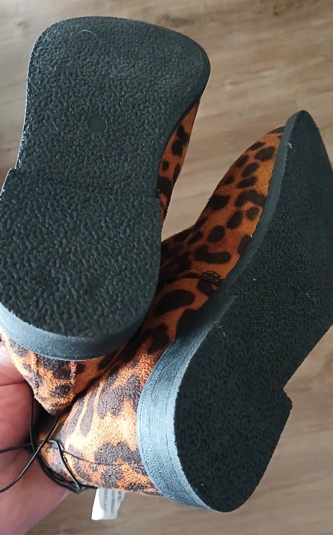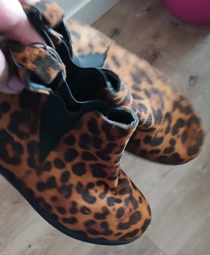 Pair of ankle boots with a leopard print. The boots have elasticated sides. The soles are a solid black color.