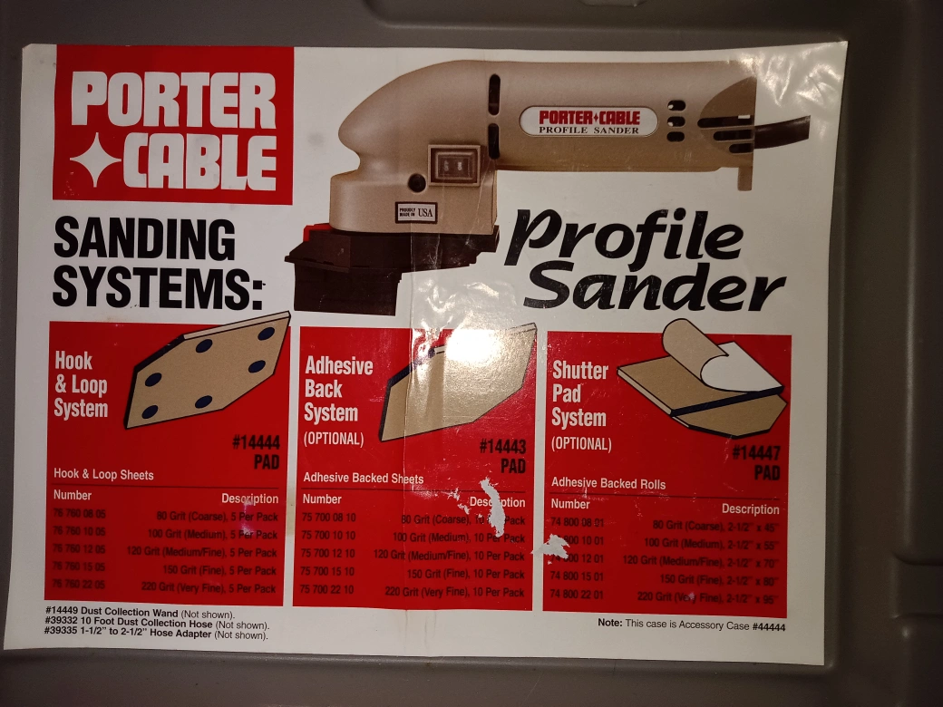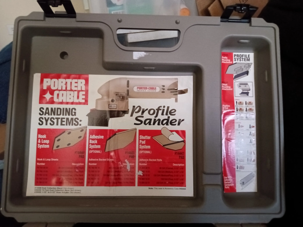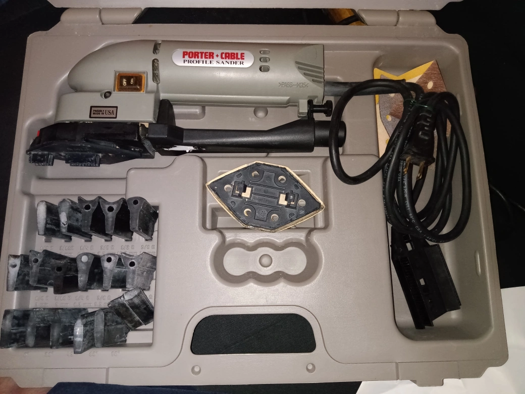 Selling a Porter-Cable Profile Sander, complete with its original case! It includes various sanding attachments and accessories, as shown in the pictures. Perfect for detailed sanding work and getting into those hard-to-reach areas