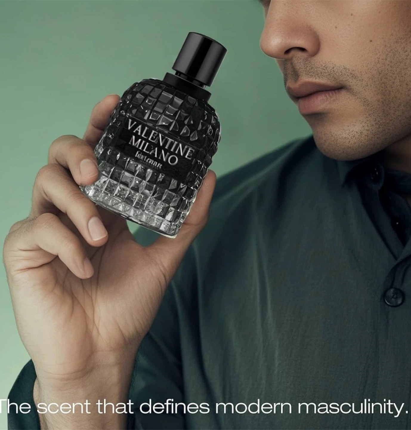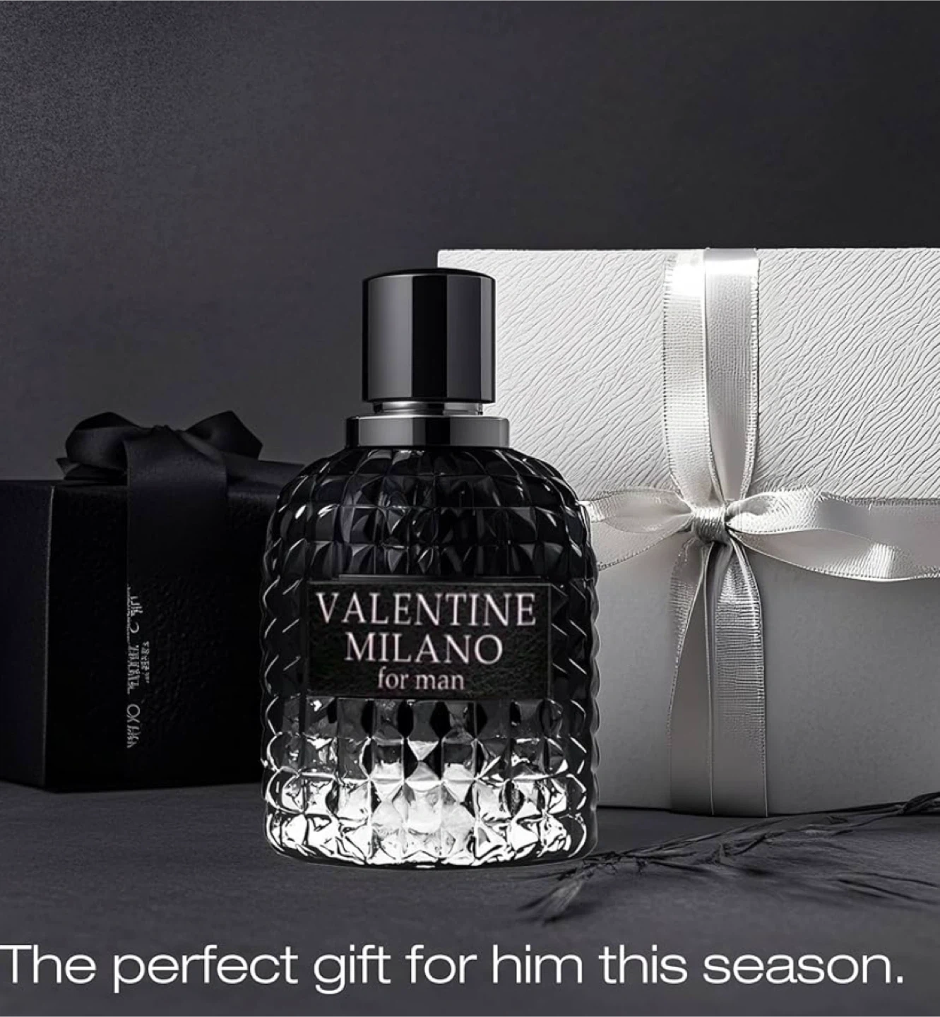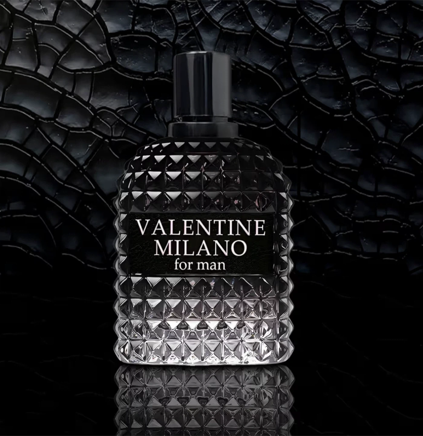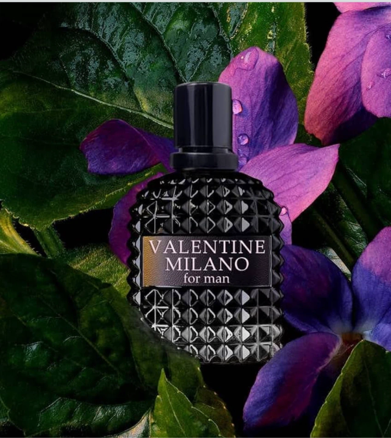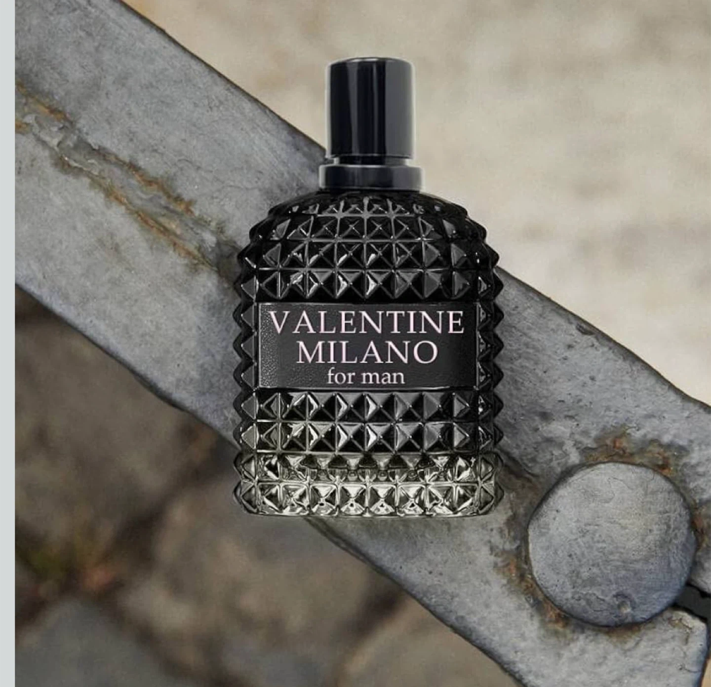 VALENTINE MILANO for Man Eau de Parfum. Distinctive glass bottle design with pyramid stud detailing. Fragrance for men.