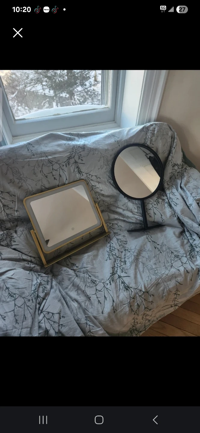 This is a lighted makeup mirror with a built-in LED light ring. It has a gold-toned frame and a convenient stand for tabletop use. The mirror is square-shaped and includes a power button with a circular light icon.