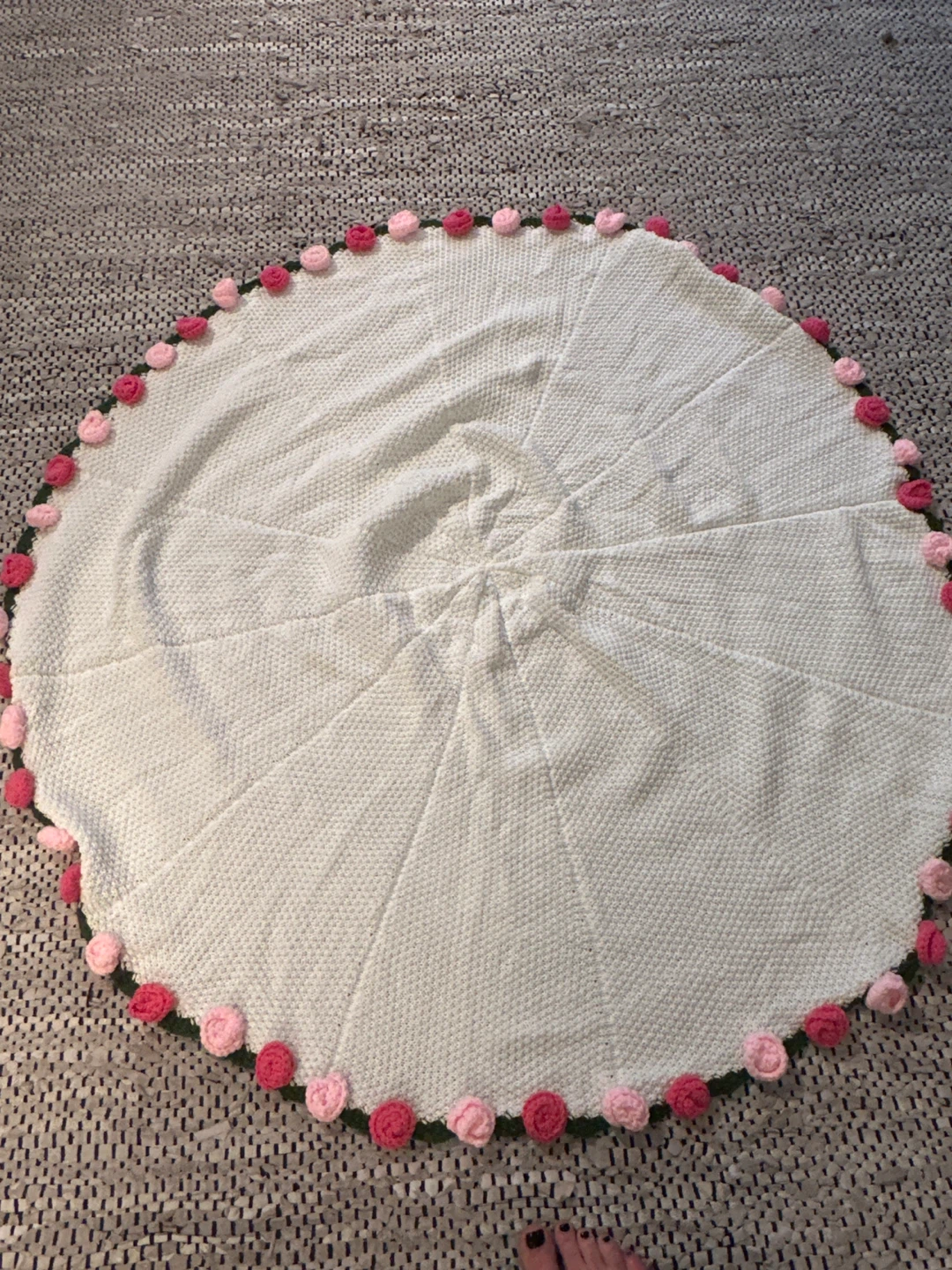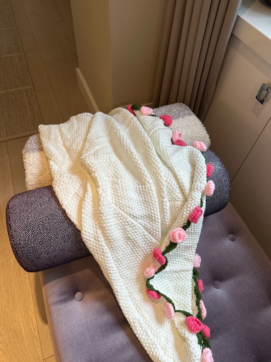 Cozy white knit throw blanket. Features a delicate crochet trim adorned with pink floral accents. Perfect for adding a touch of charm to any room!