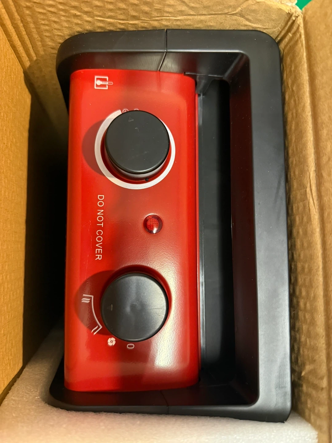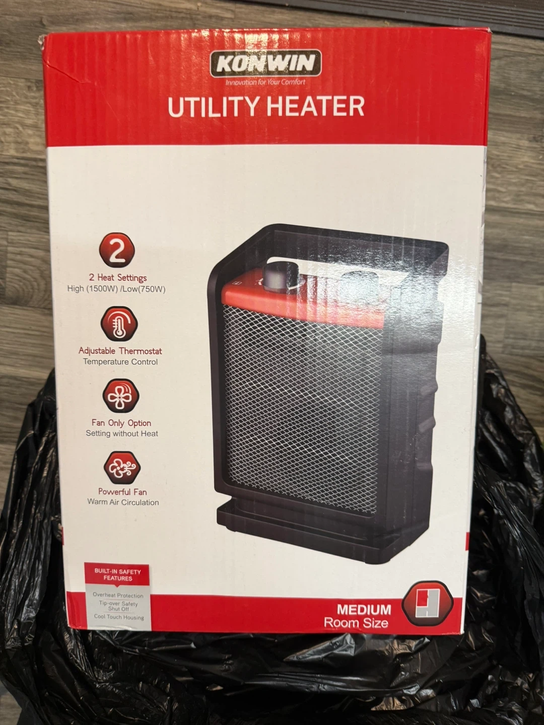 This Konwin utility heater has two heat settings: High (1500W) and Low (750W). It features an adjustable thermostat and a fan-only option. Built-in safety features include overheat protection and auto shut-off.