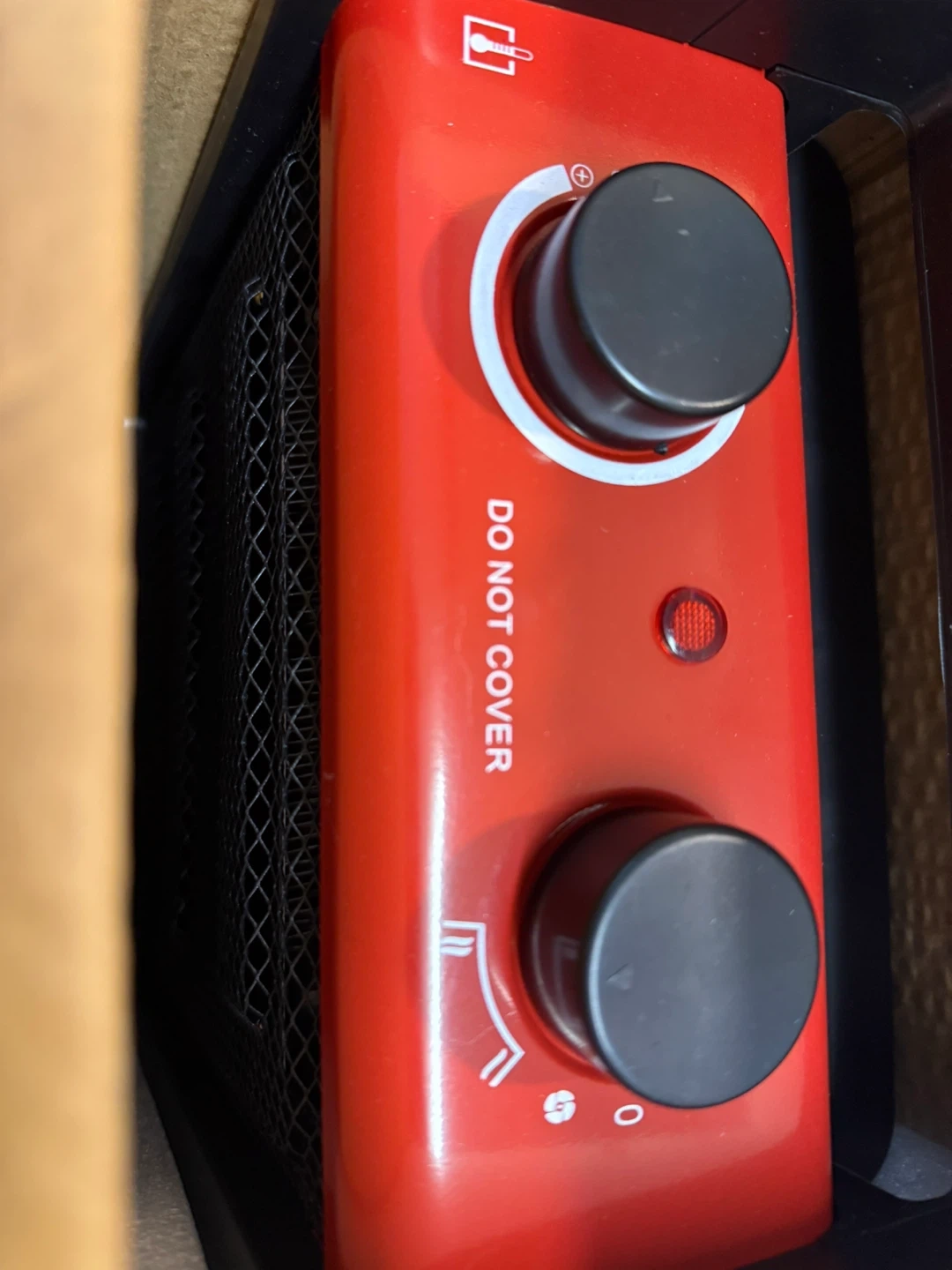 This Konwin utility heater has two heat settings: High (1500W) and Low (750W). It features an adjustable thermostat and a fan-only option. Built-in safety features include overheat protection and auto shut-off.