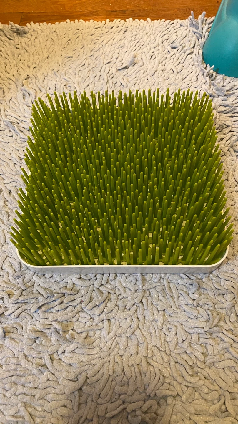 This green bottle drying rack features numerous flexible pegs for drying bottles and accessories. It includes a white tray to catch excess water. This rack is useful for parents and caregivers to dry baby bottles, sippy cups, and pump parts.