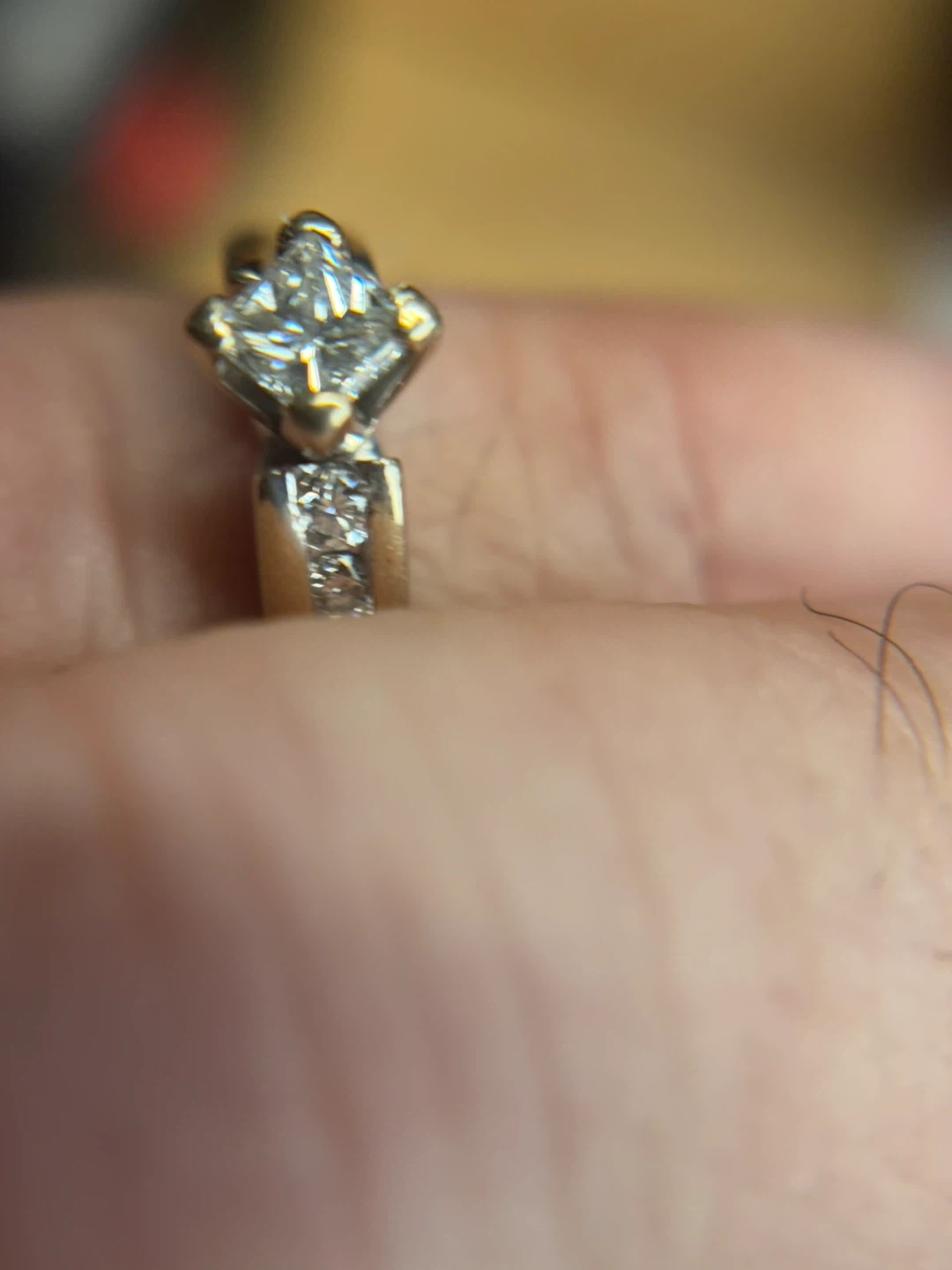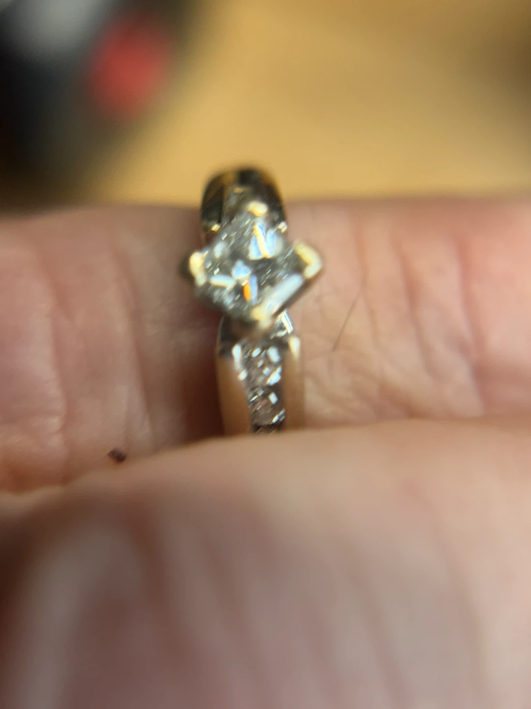 Selling a beautiful solid 14 Kt white gold with 0.25 Ct princes cut diamond ring and 6 side diamonds total weight 0.3 Ct, total weight is 4.2. grams, size 5 3/4 in great condition.