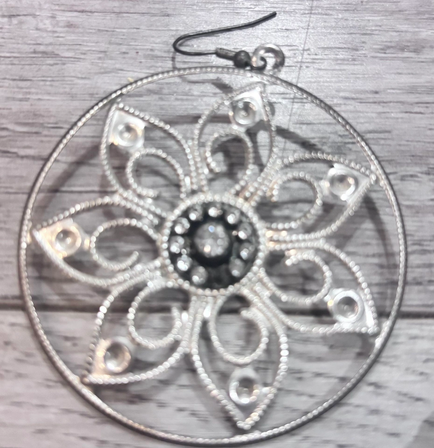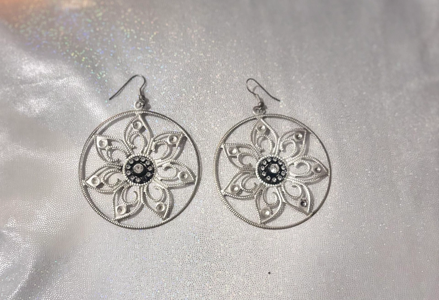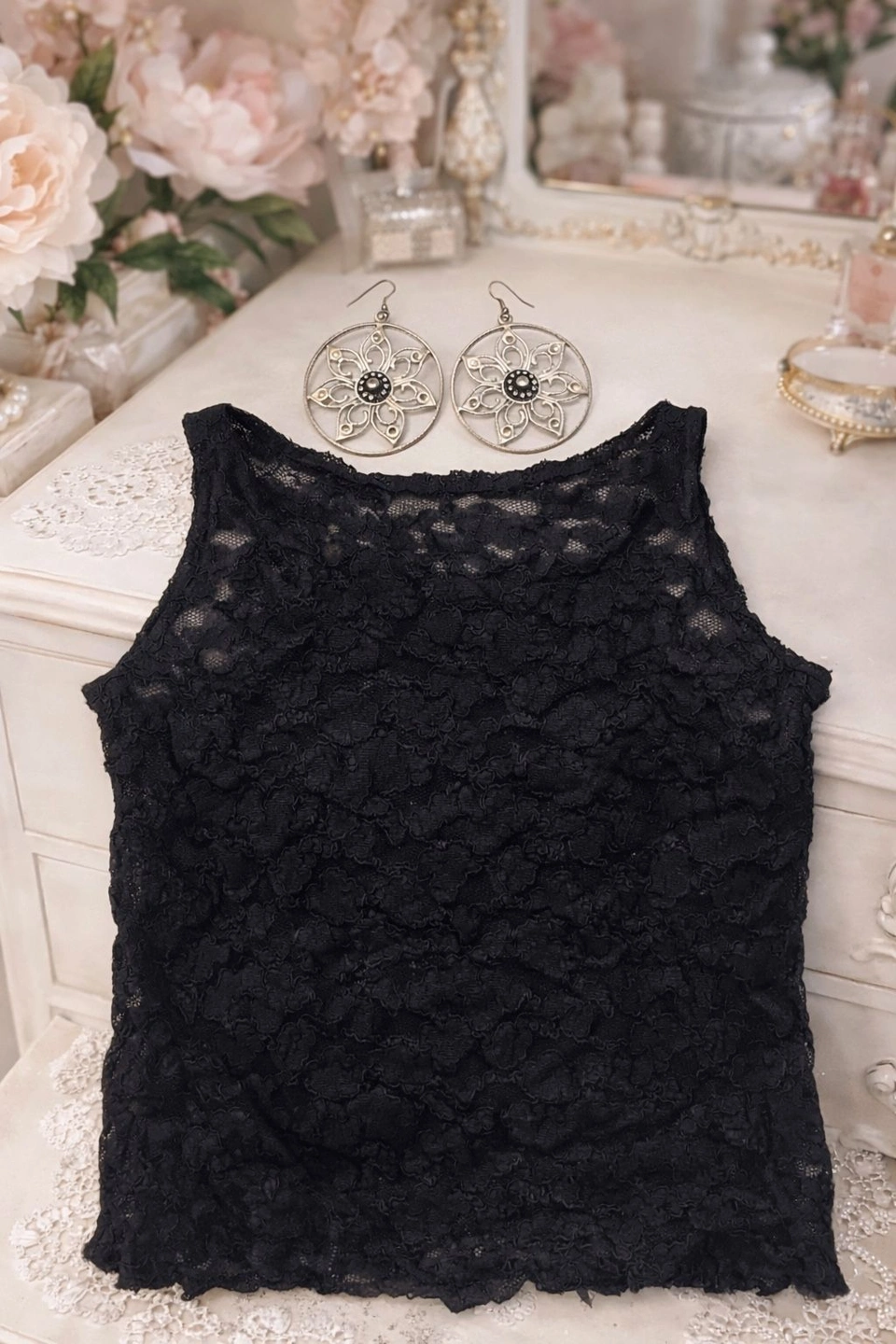 Ann Taylor Sheer Black Lace Top + Silver Floral Earrings