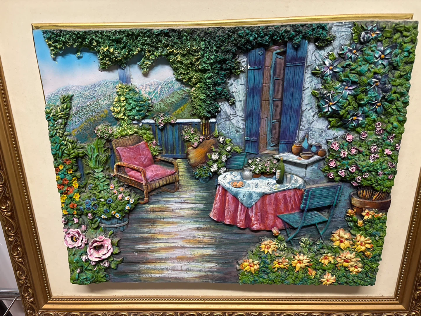 Beautiful framed 3D art piece depicting a floral garden scene. The frame is ornate and golden, adding a touch of elegance to the detailed artwork. Perfect for adding a touch of nature and charm to any room