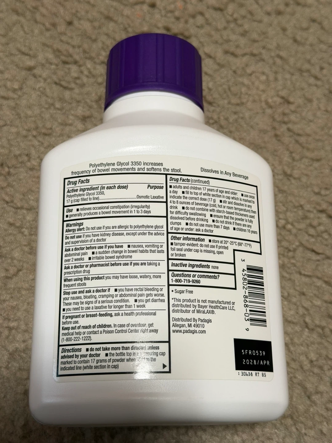 Selling a bottle of Padagis Polyethylene Glycol 3350 Powder for Solution, an osmotic laxative. It's an unflavored powder and grit-free. Net weight is 17.9 oz (510 g).