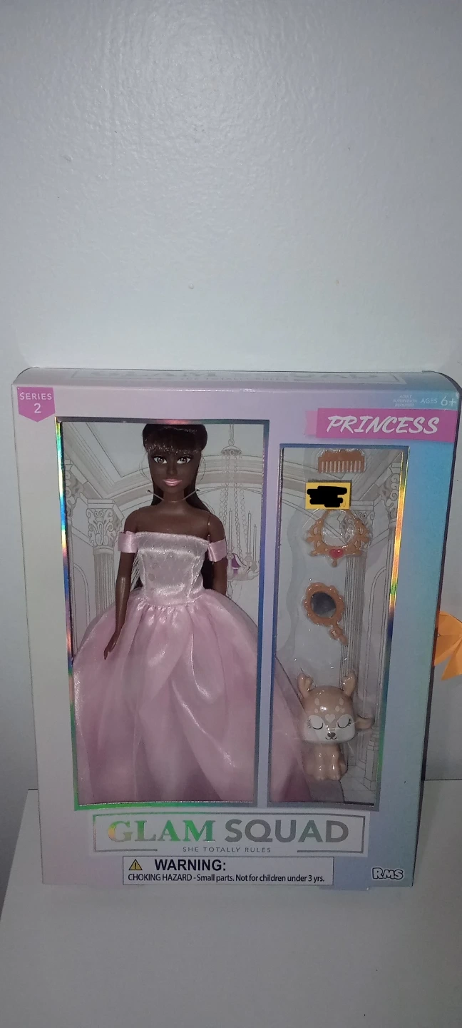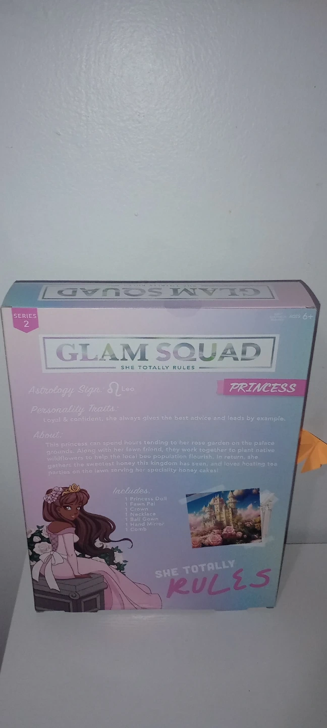 This is the Glam Squad Series 2 Princess doll. It includes a doll, a crown, a hairbrush, a mirror, a companion pal, a gown, and shoes. Recommended for ages 6 and up.