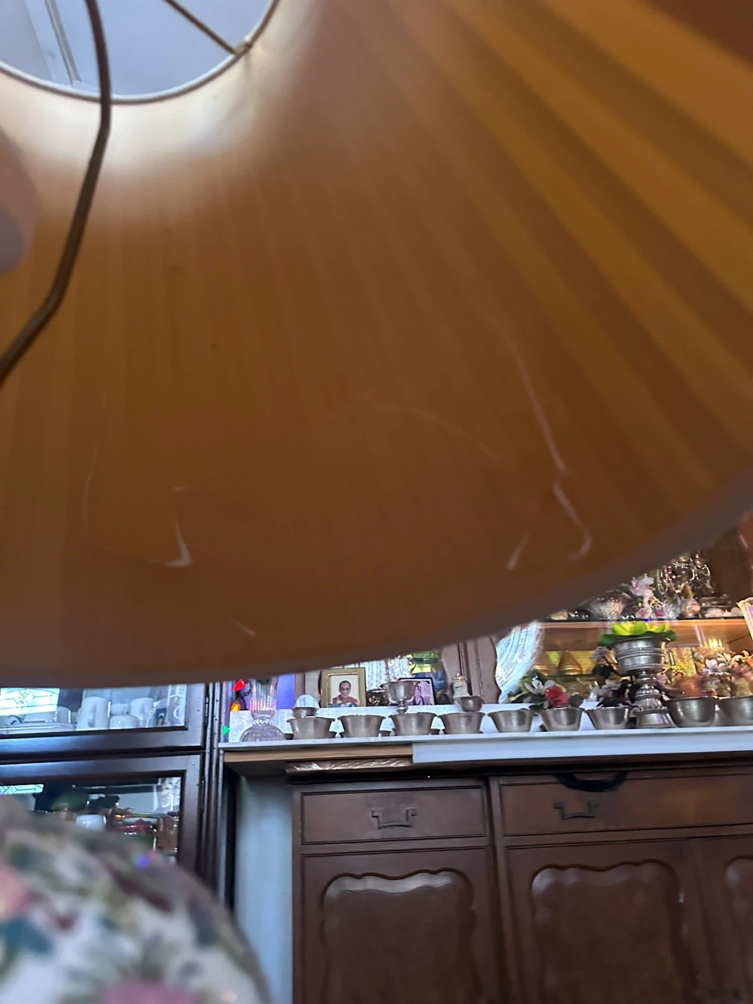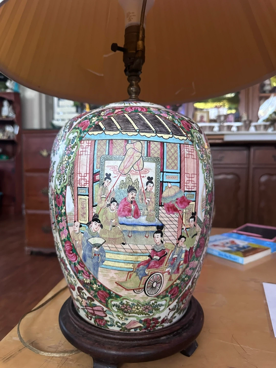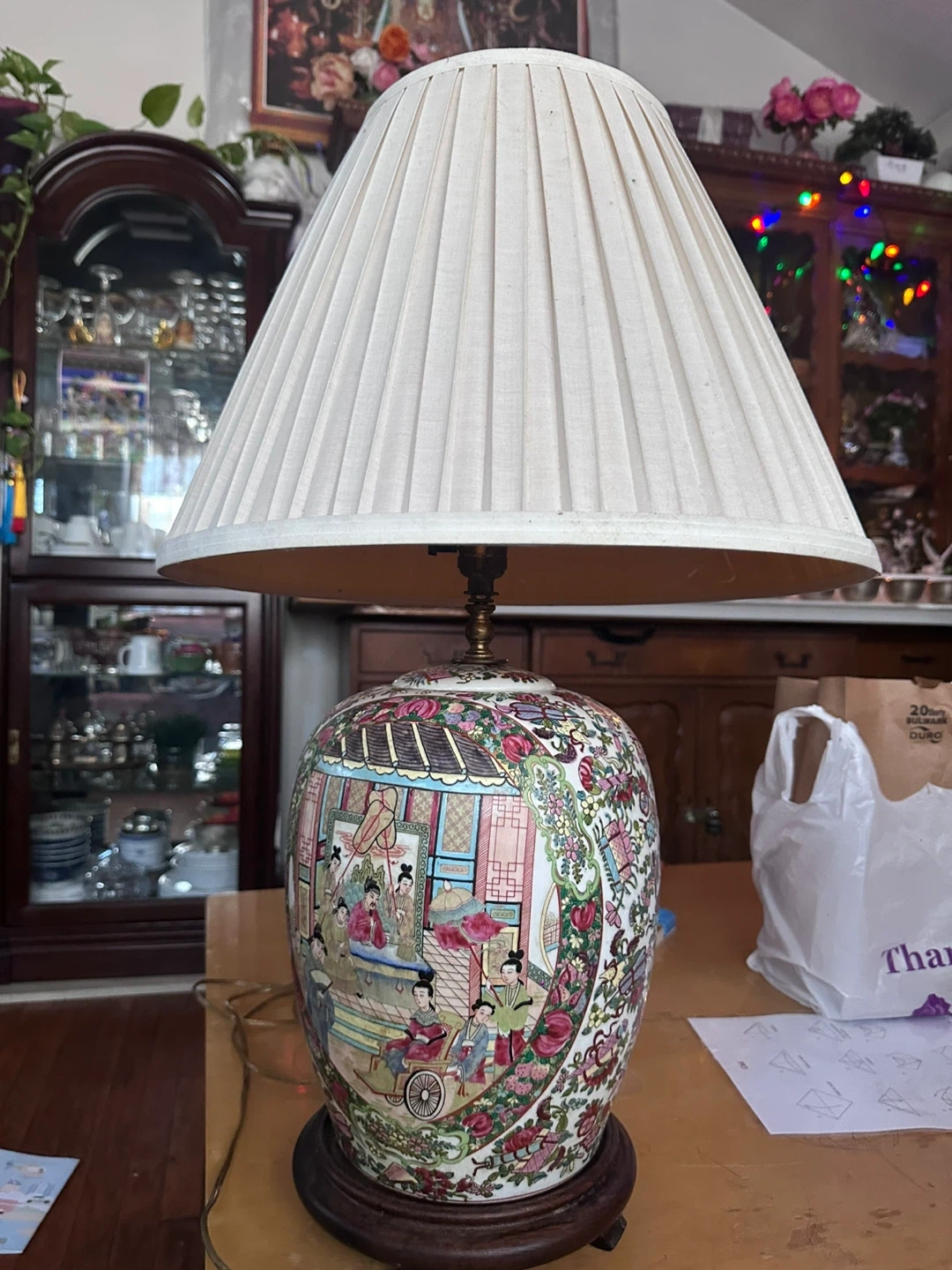 This is a decorative table lamp with a porcelain base featuring a detailed traditional Asian-inspired scene. It has a pleated fabric lampshade. This lamp adds a unique decorative touch to any room!