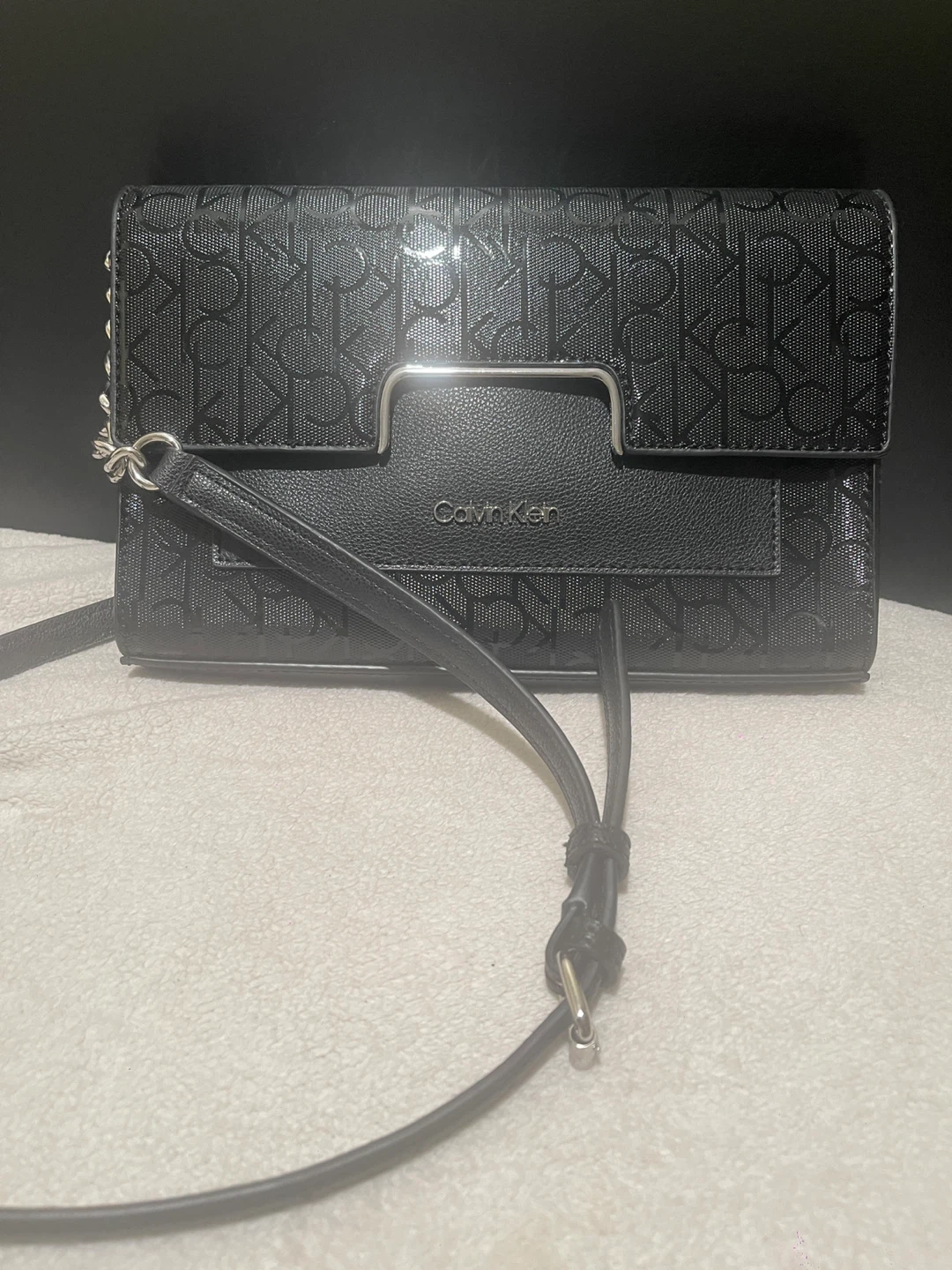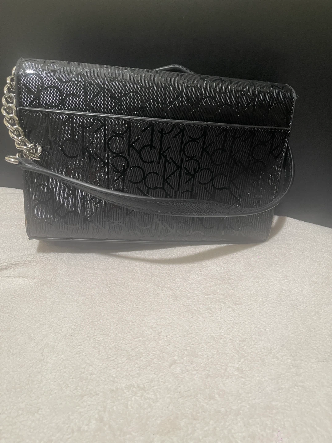 Stylish black shoulder bag from Calvin Klein featuring an all-over monogram pattern. It has a sleek, modern design with a silver-tone clasp and chain detailing. Perfect for a night out or adding a chic touch to any outfit!