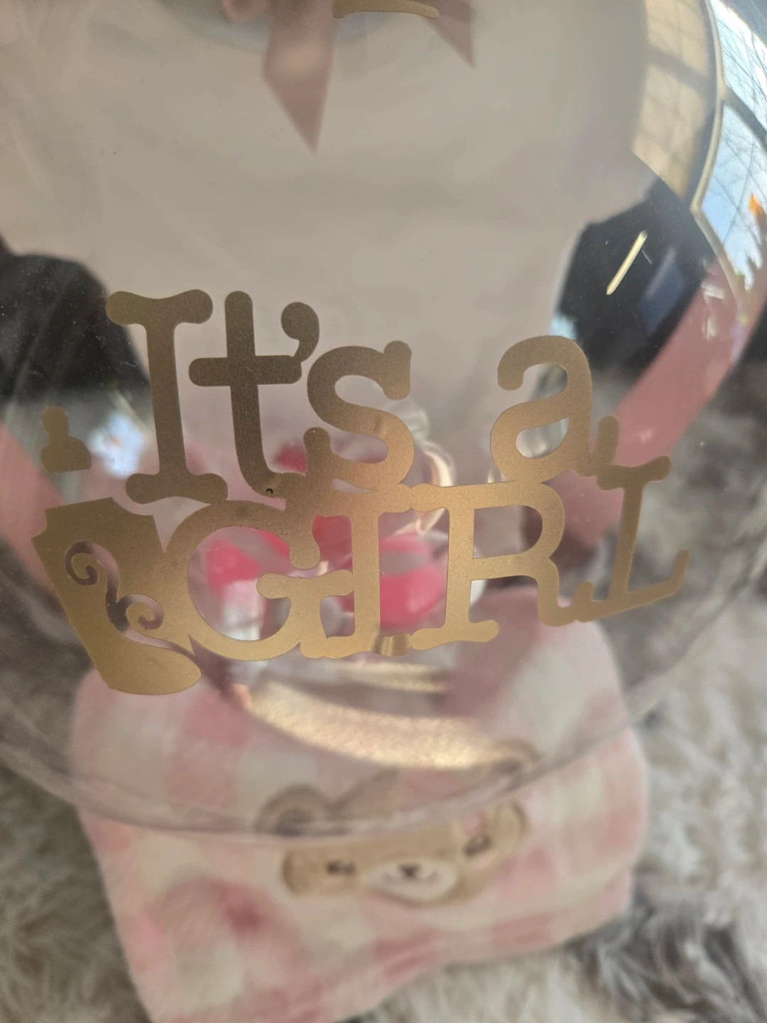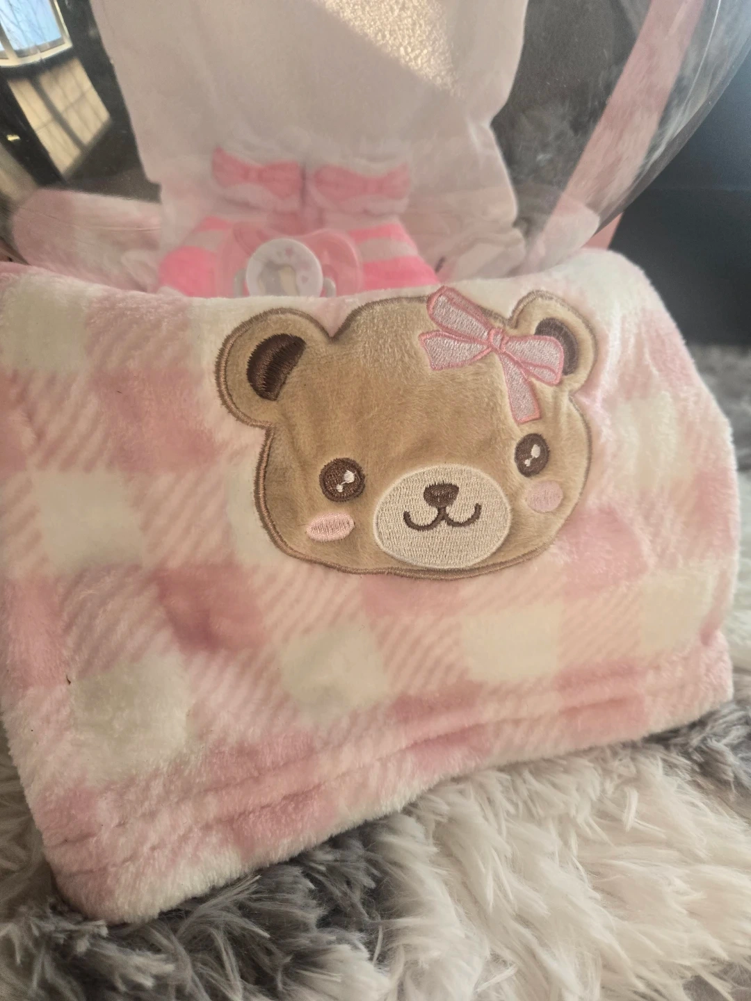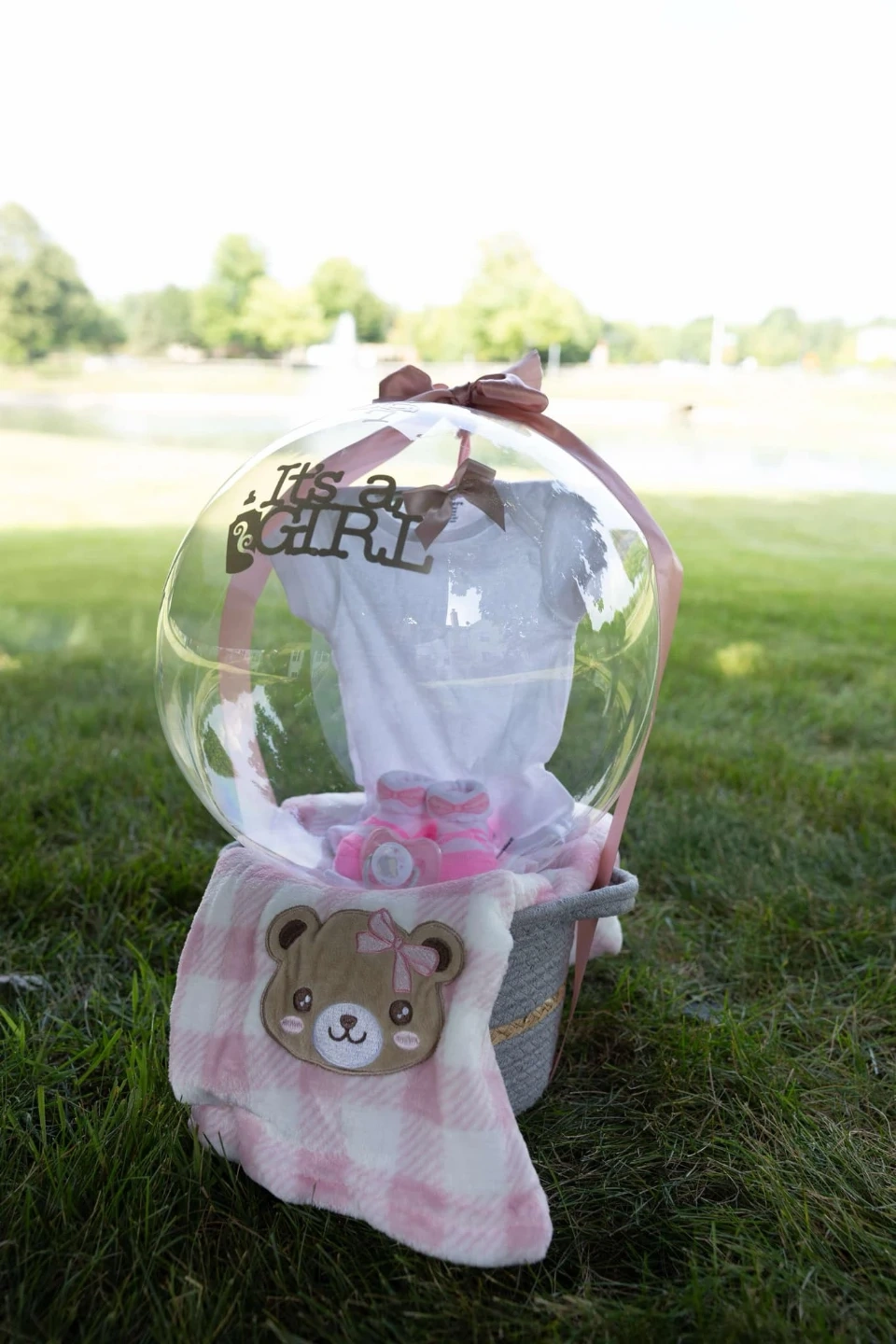 This adorable baby girl gift set includes a onesie, socks, a blanket with a cute bear design, and a pacifier. It's all bundled together in a decorative balloon. Perfect as a baby shower gift or a welcome-to-the-world present!