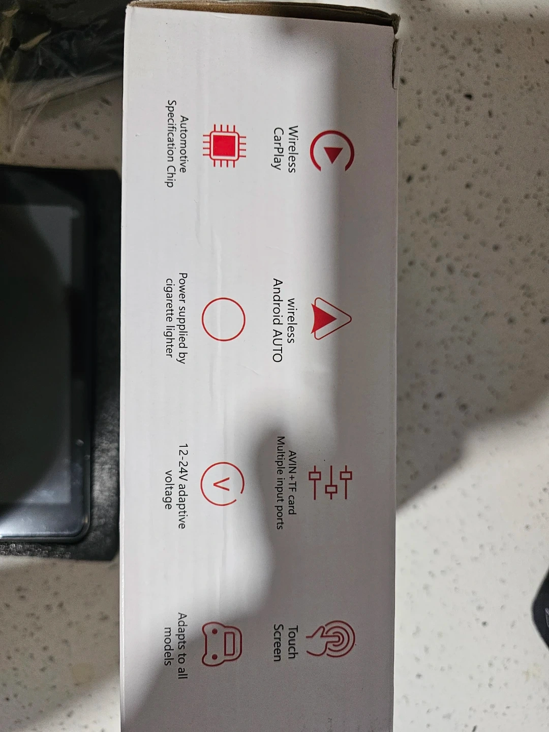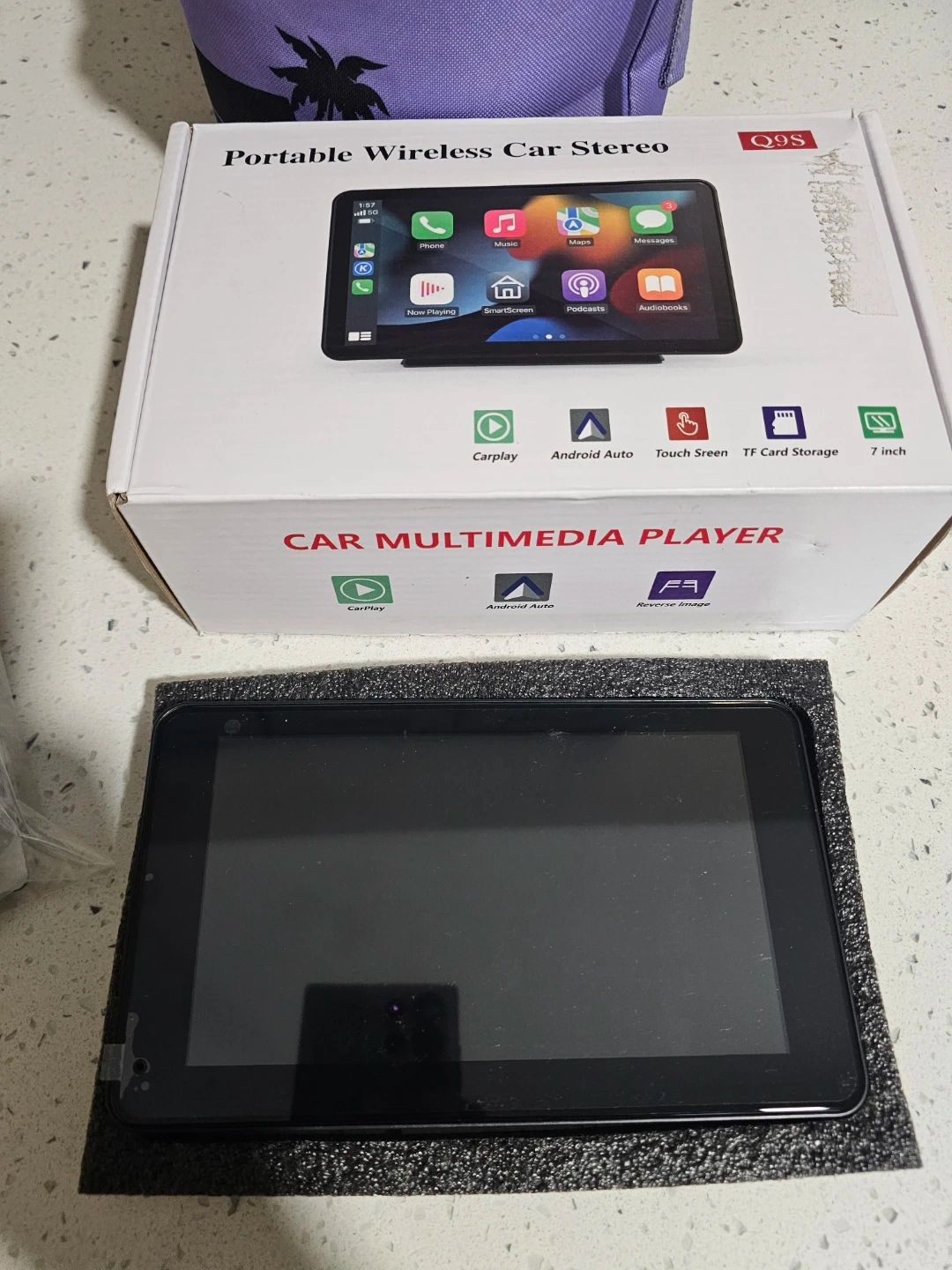Selling a portable wireless car stereo and multimedia player. It has wireless CarPlay and Android Auto. The screen is a 7 inch touch screen. It also supports TF card storage. The box is included along with the components.