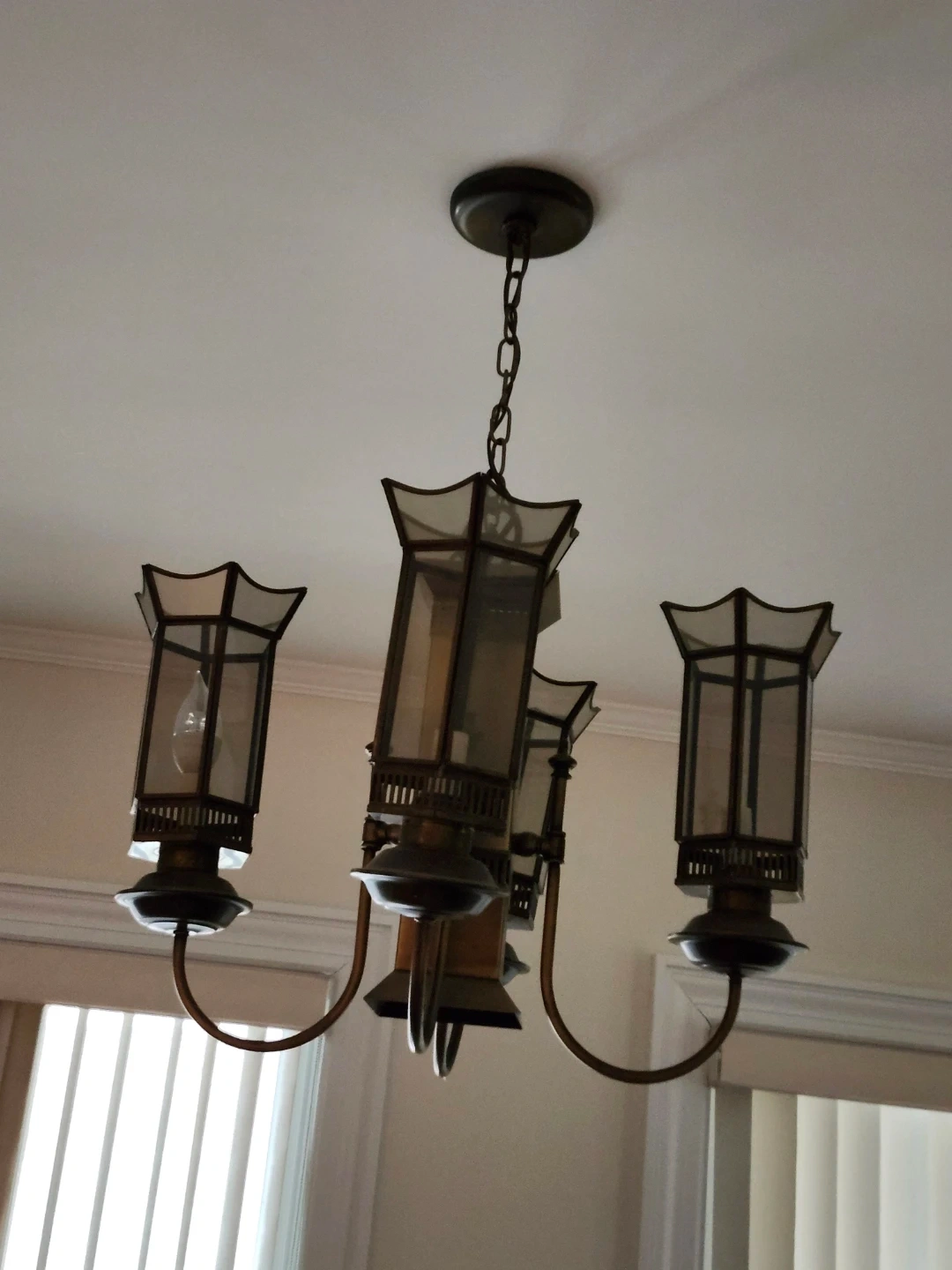 This is a 4-light chandelier with amber glass shades. It features an antique brass finish. The chandelier includes a chain for hanging. It's ready to add a warm glow to your space!
