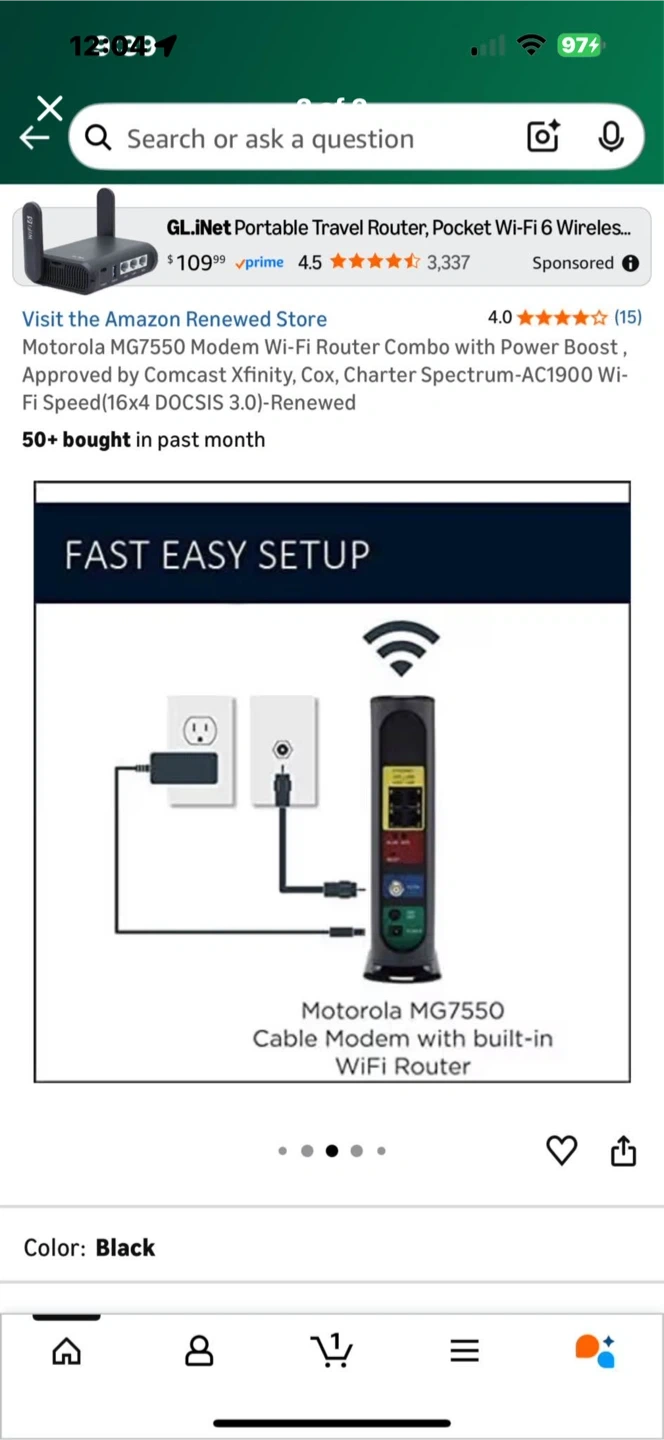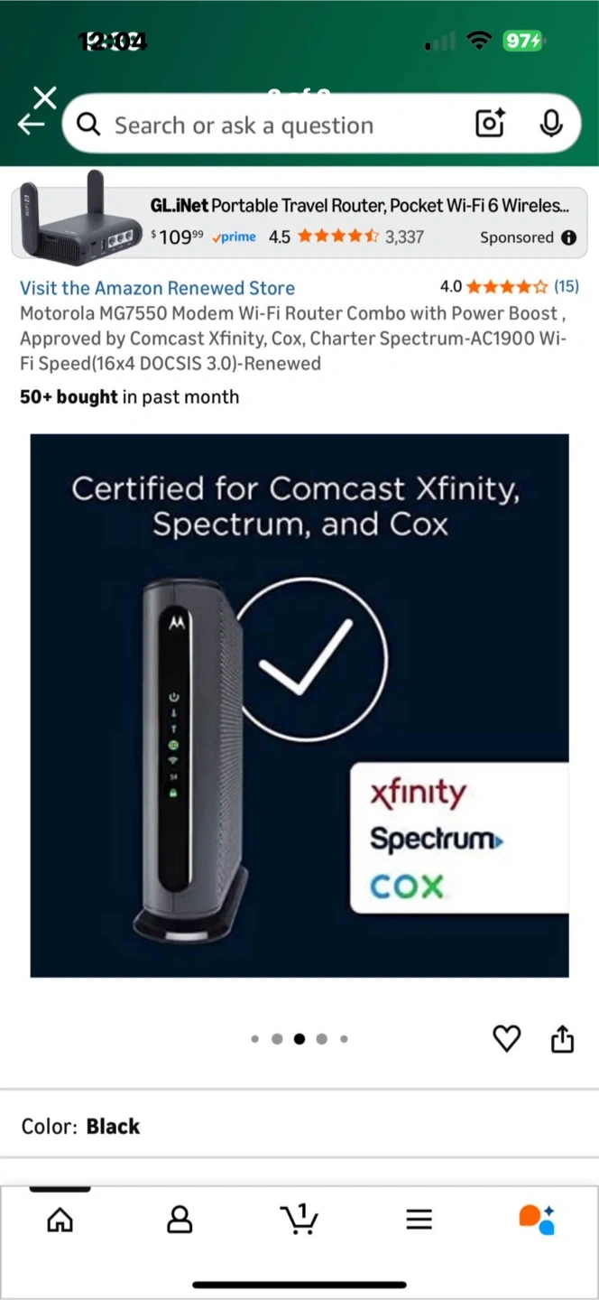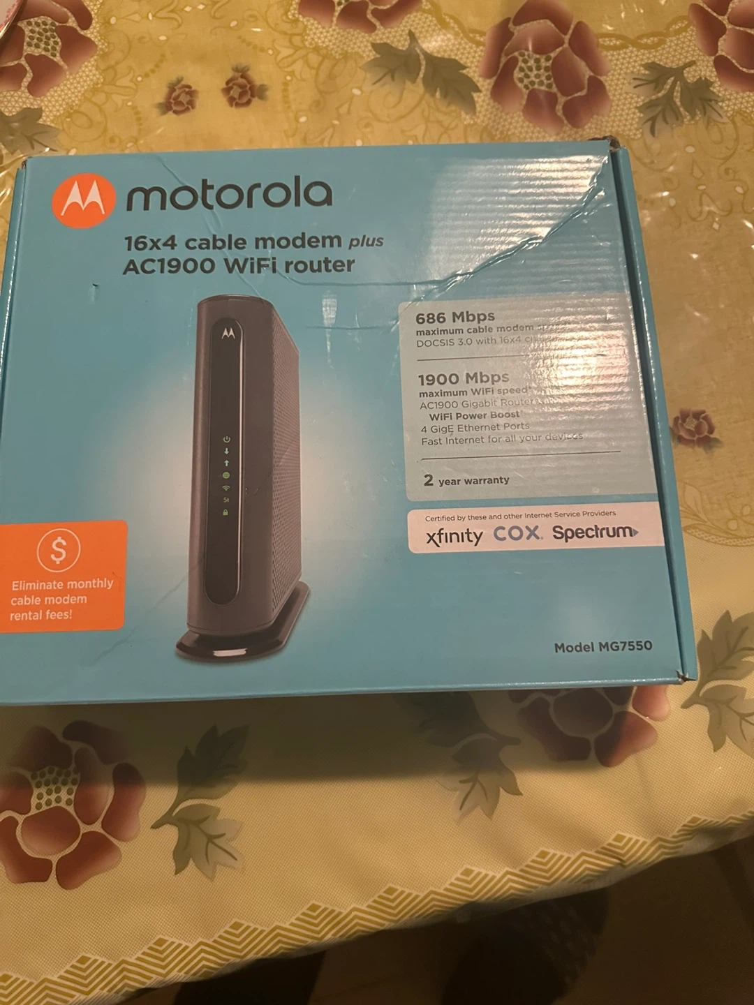 Selling a Motorola MG7550 cable modem plus AC1900 WiFi router in black. It's certified for Comcast Xfinity, Spectrum, and Cox. The box is included. It eliminates monthly cable modem rental fees!