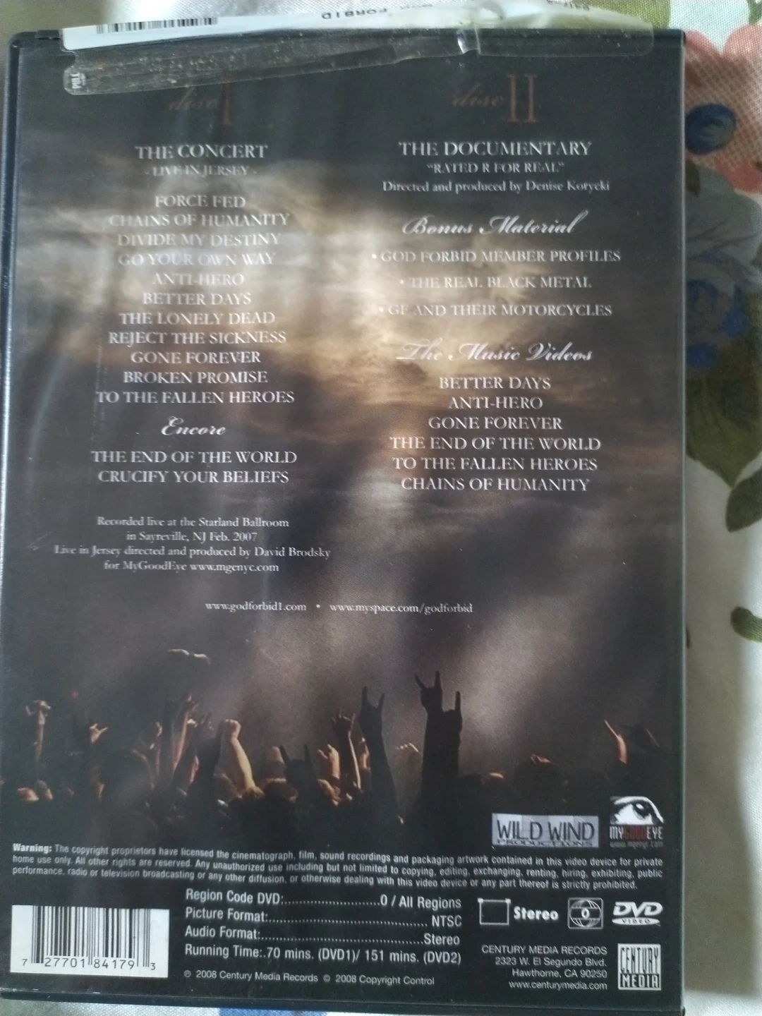 Selling a God Forbid DVD, "Beneath the Scars of Glory and Progression". This DVD includes a live concert in New Jersey, a documentary called "Rated R for Real", bonus material with God Forbid member profiles, and music videos. Recorded live at the Starland Ballroom in Sayreville, NJ in Feb 2007