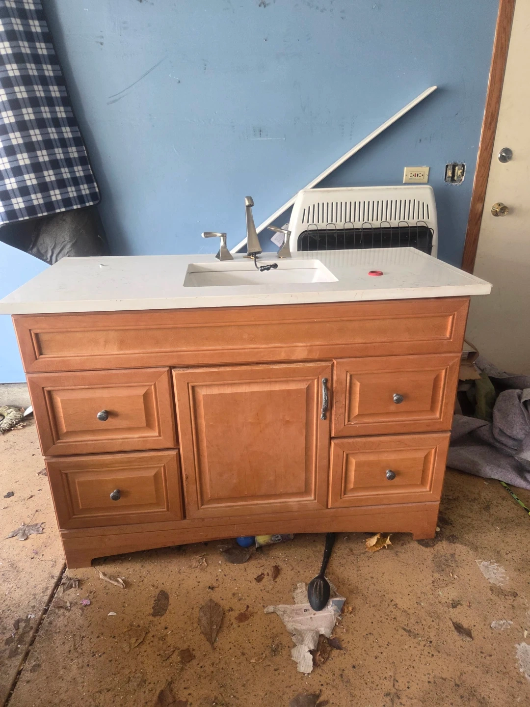 This wooden vanity features a white composite sink and a brushed nickel faucet. It has multiple drawers and cabinet doors for storage. The wood has a light maple finishIt's a great piece for a bathroom remodel!