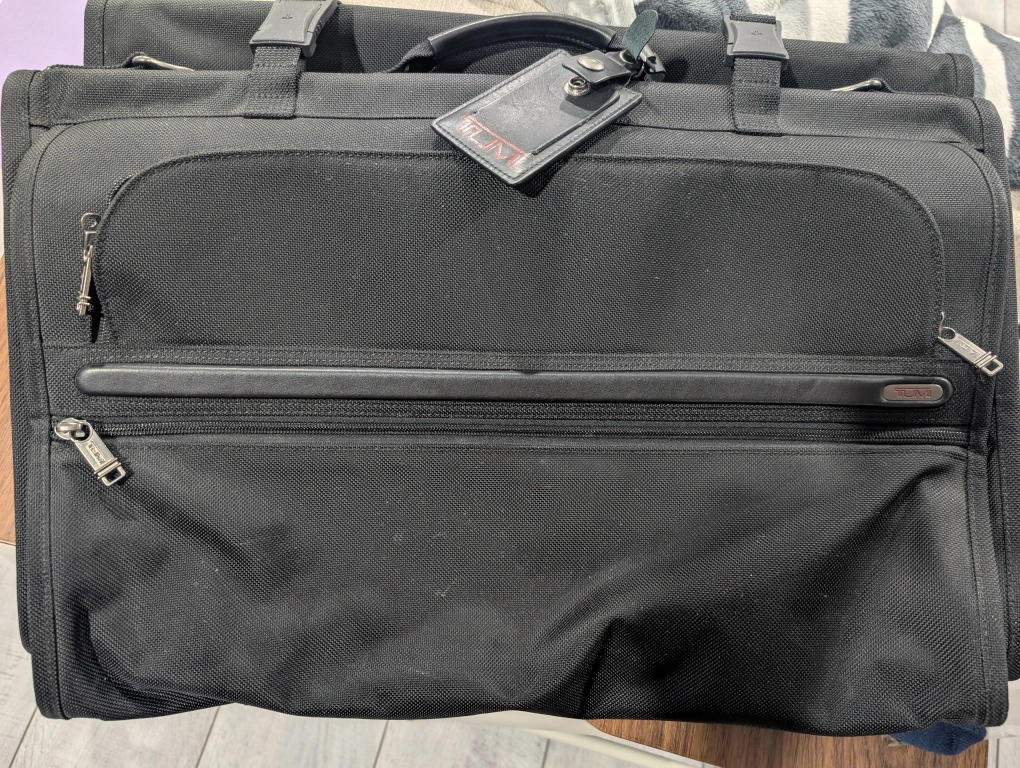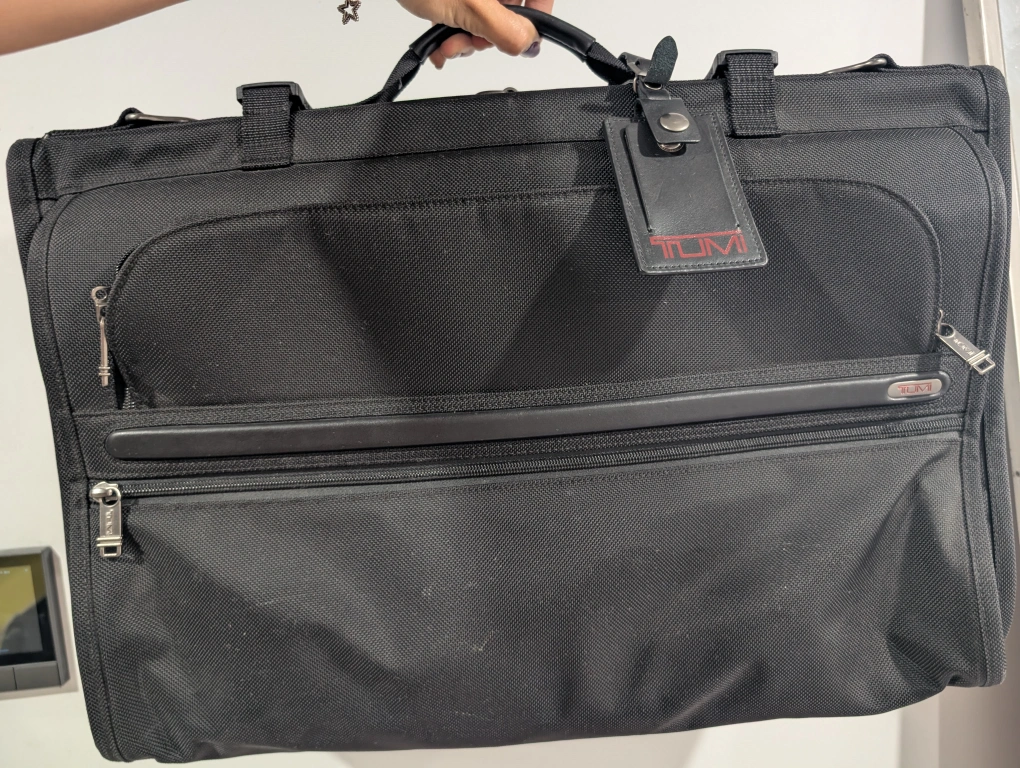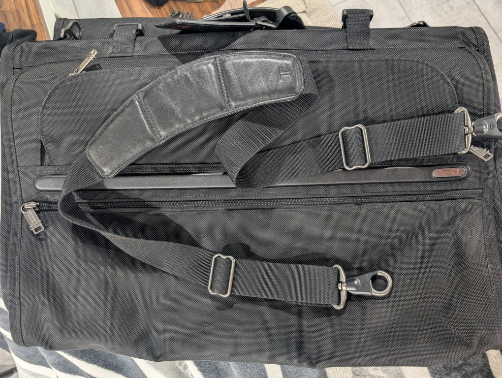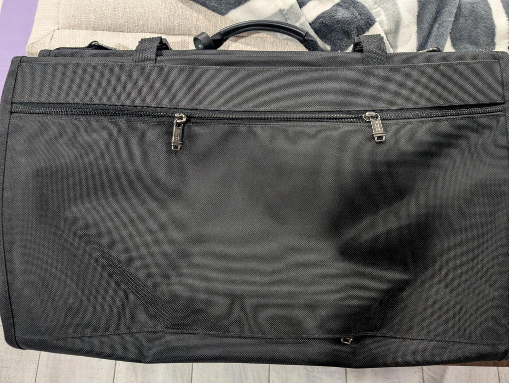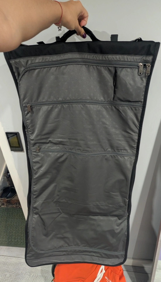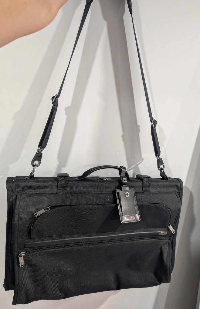 I have a gorgeous black garment bag, perfect for travel. The bag features multiple exterior and interior pockets. It includes a handle and a detachable shoulder strap.