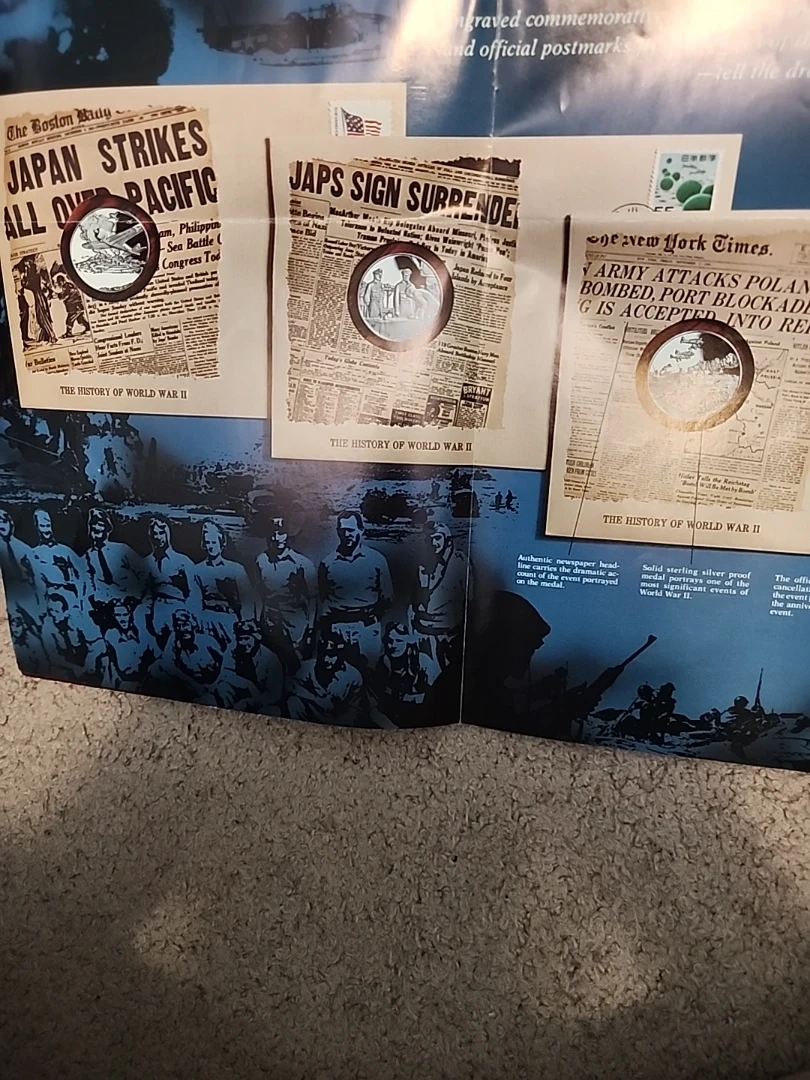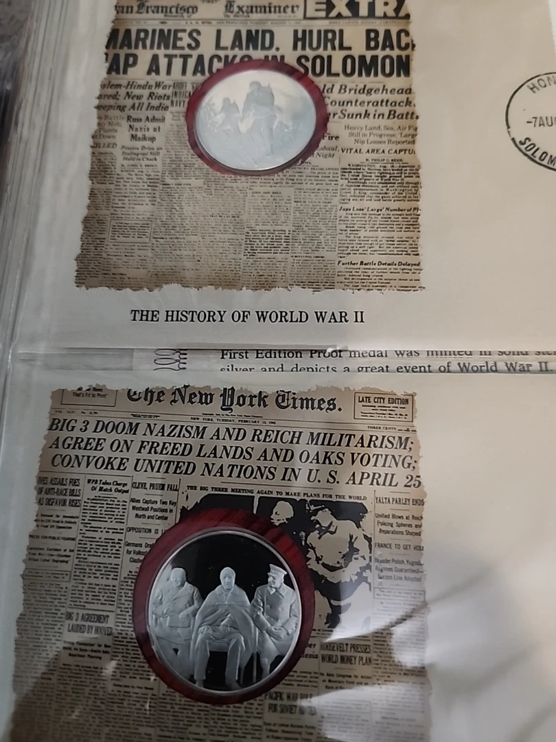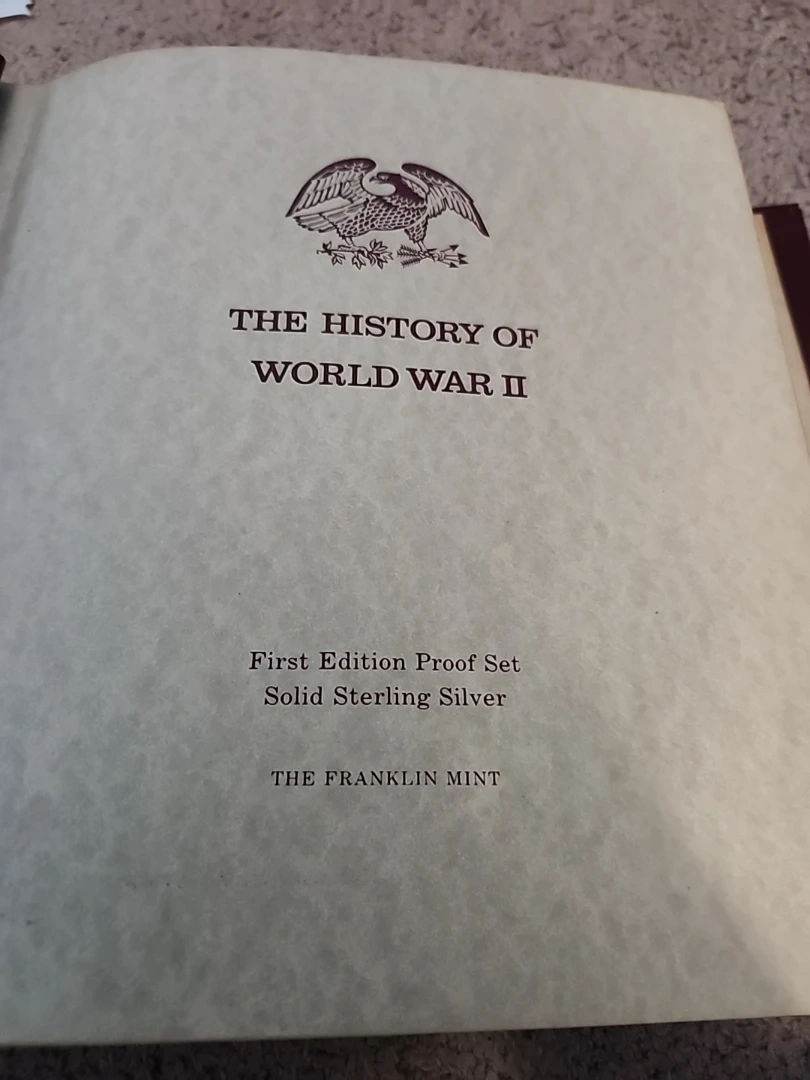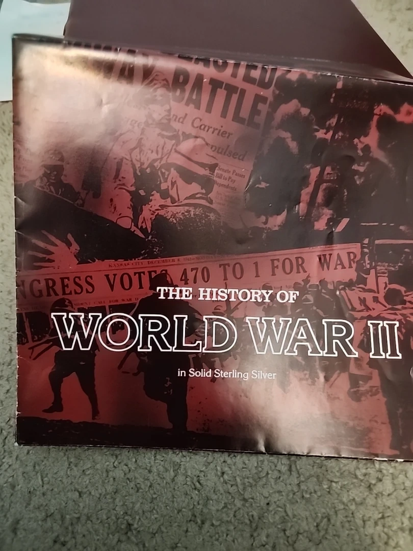 This is a first edition proof set in solid sterling silver documenting The History of World War II. It includes genuine historical newspaper headlines and sterling silver proof coins. Commemorates significant events of the war. VERY RARE DIFFICULT TO FIND, 50 PROOF COINS, APP=30 grams Sterling Silver, AROUND 25 OZ OF PURE SILVER