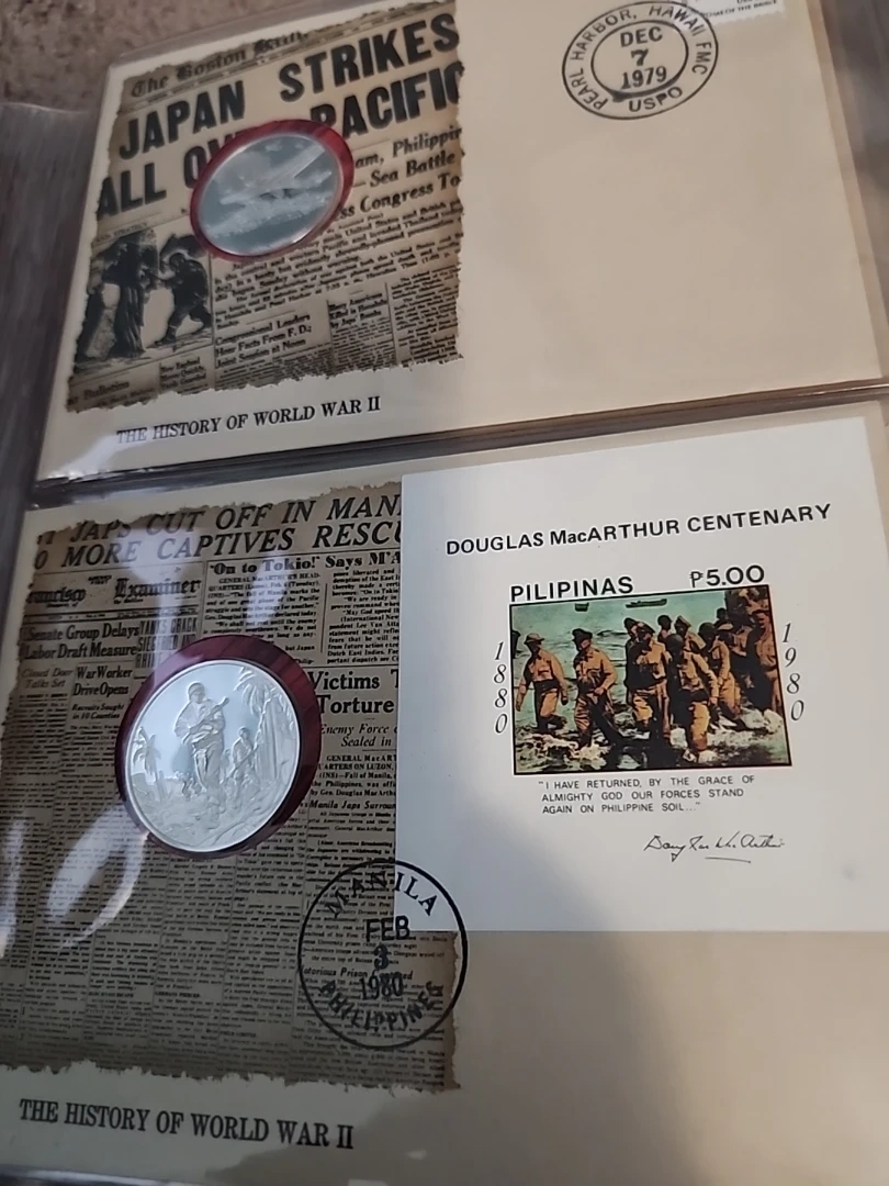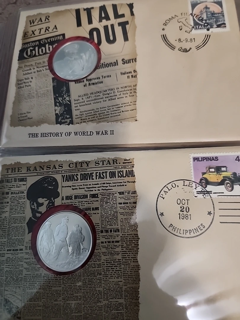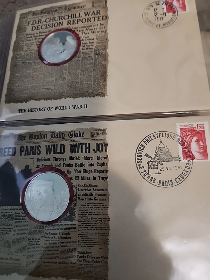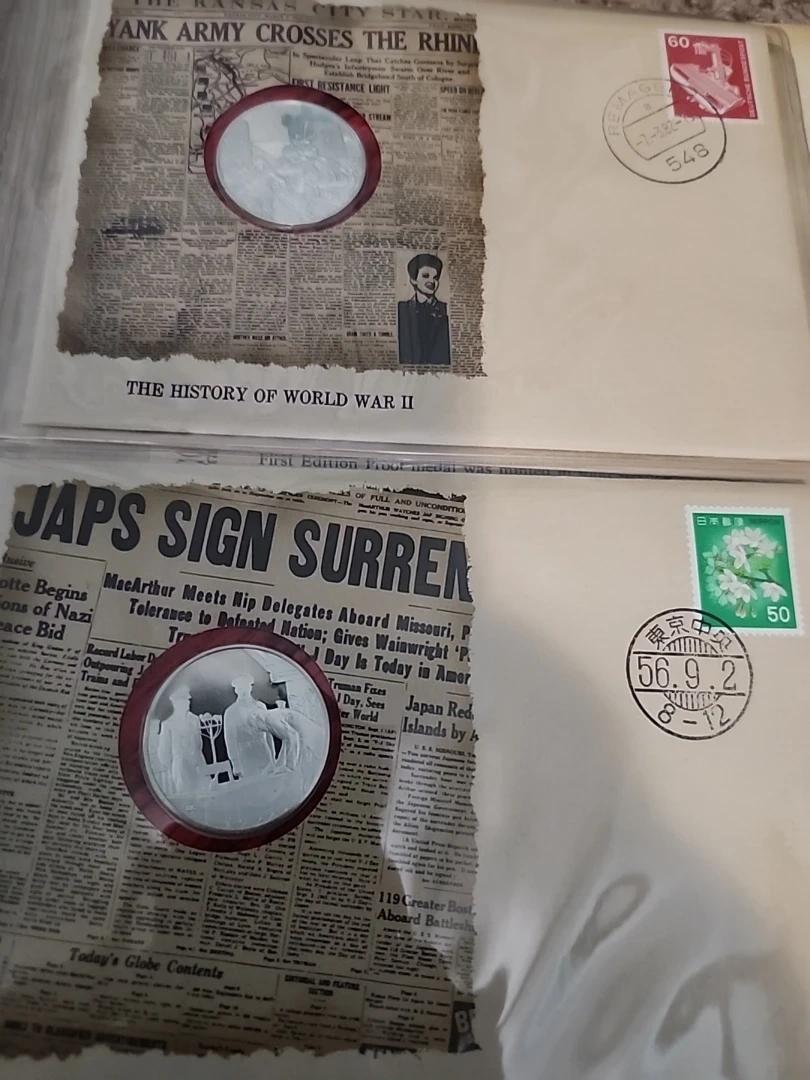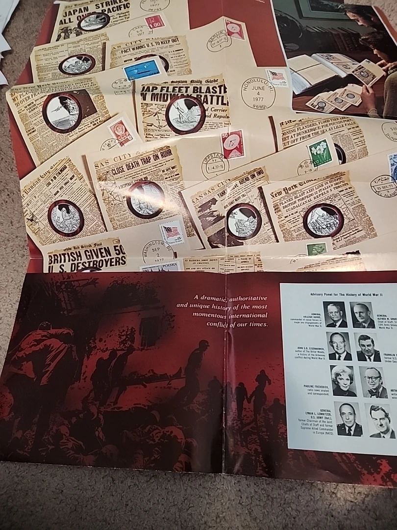 This is a first edition proof set in solid sterling silver documenting The History of World War II. It includes genuine historical newspaper headlines and sterling silver proof coins. Commemorates significant events of the war. VERY RARE DIFFICULT TO FIND, 50 PROOF COINS, APP=30 grams Sterling Silver, AROUND 25 OZ OF PURE SILVER