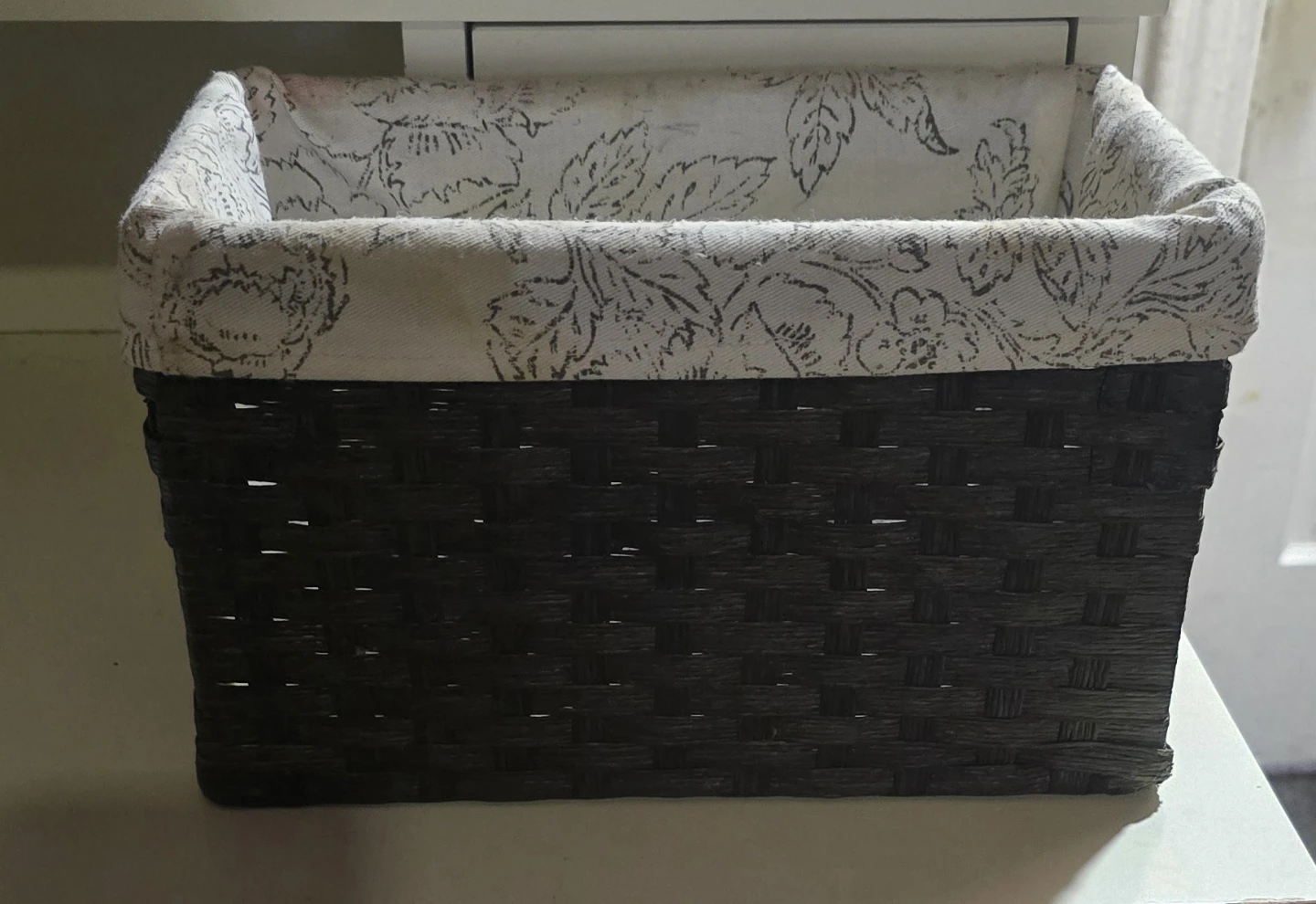 🥕This woven storage basket features a dark gray woven exterior and a white fabric liner with a floral pattern. It's a great size for organizing shelves or countertops. The liner is removable for easy cleaning. It's perfect for storing small items like toiletries, craft supplies, or desk accessories!