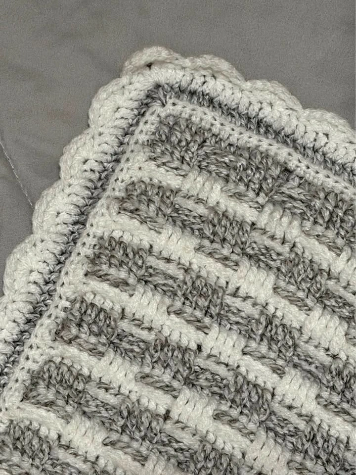 Beautiful hand crocheted baby blanket in soft gray and white with a lovely textured basket-weave style pattern and delicate scalloped edging. The neutral colors make it a perfect fit for a nursery, stroller, or as a thoughtful baby shower gift for a boy or girl.