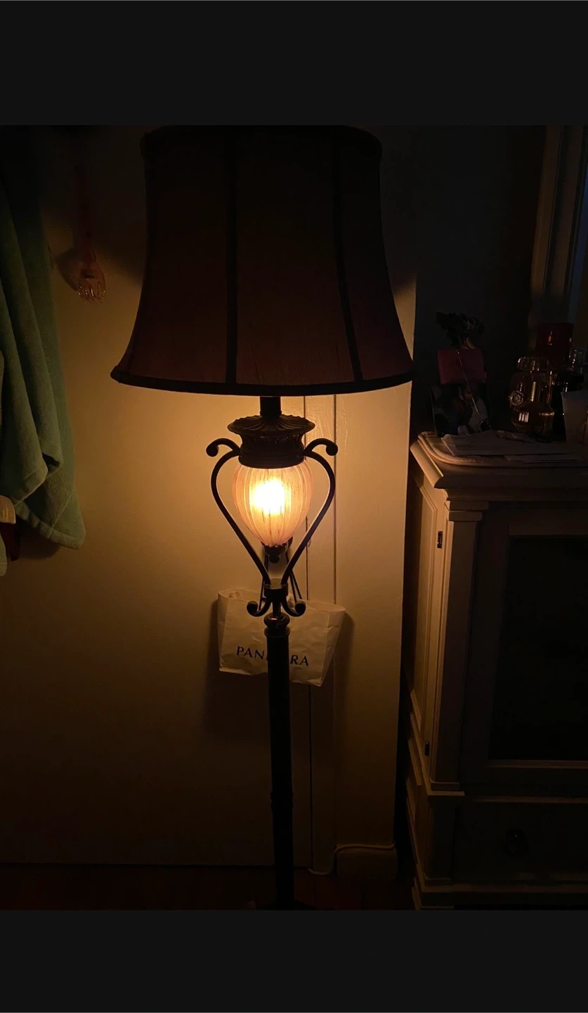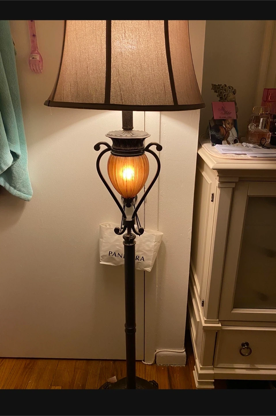 Here's a standing floor lamp with a shade. It has a unique design with a decorative center piece. The center piece is a night light. It's perfect for adding a warm glow to any room. From Raymour and Flanigan