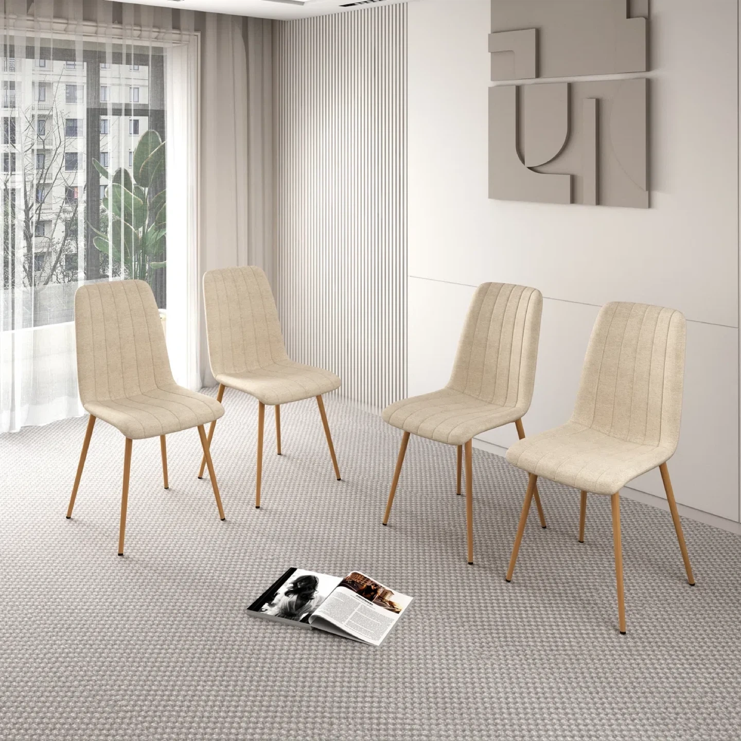 Set of four upholstered dining chairs. Features a striped fabric in a neutral beige color. Metal legs provide sturdy support. These chairs offer comfortable seating for your dining area.