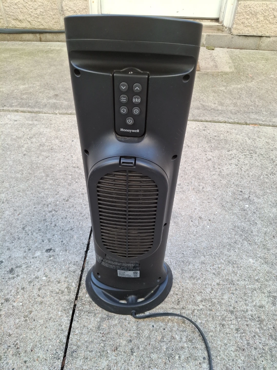 The Honeywell HCE323V 1500W Digital Ceramic Tower Heater with Motion Sensor is a sleek black tower heater that operates on a fan and electric power source. With a heating element format of coil, it is designed for convection heating and has a BTU heating rating of less than 2000 BTU. This heater offers 2 heat settings, a timer control of 8 hours, and features like a thermostat, auto shut-off, timer, and oscillation for customizable comfort. Its compact dimensions of 8.7 inches in length, depth, and 6.6 inches in width make it suitable for floor, desk, or tabletop mounting, providing warmth in a space of 201-250 sq ft. Made by the trusted brand Honeywell in the year 2000, this tower heater is a reliable and efficient heating solution.