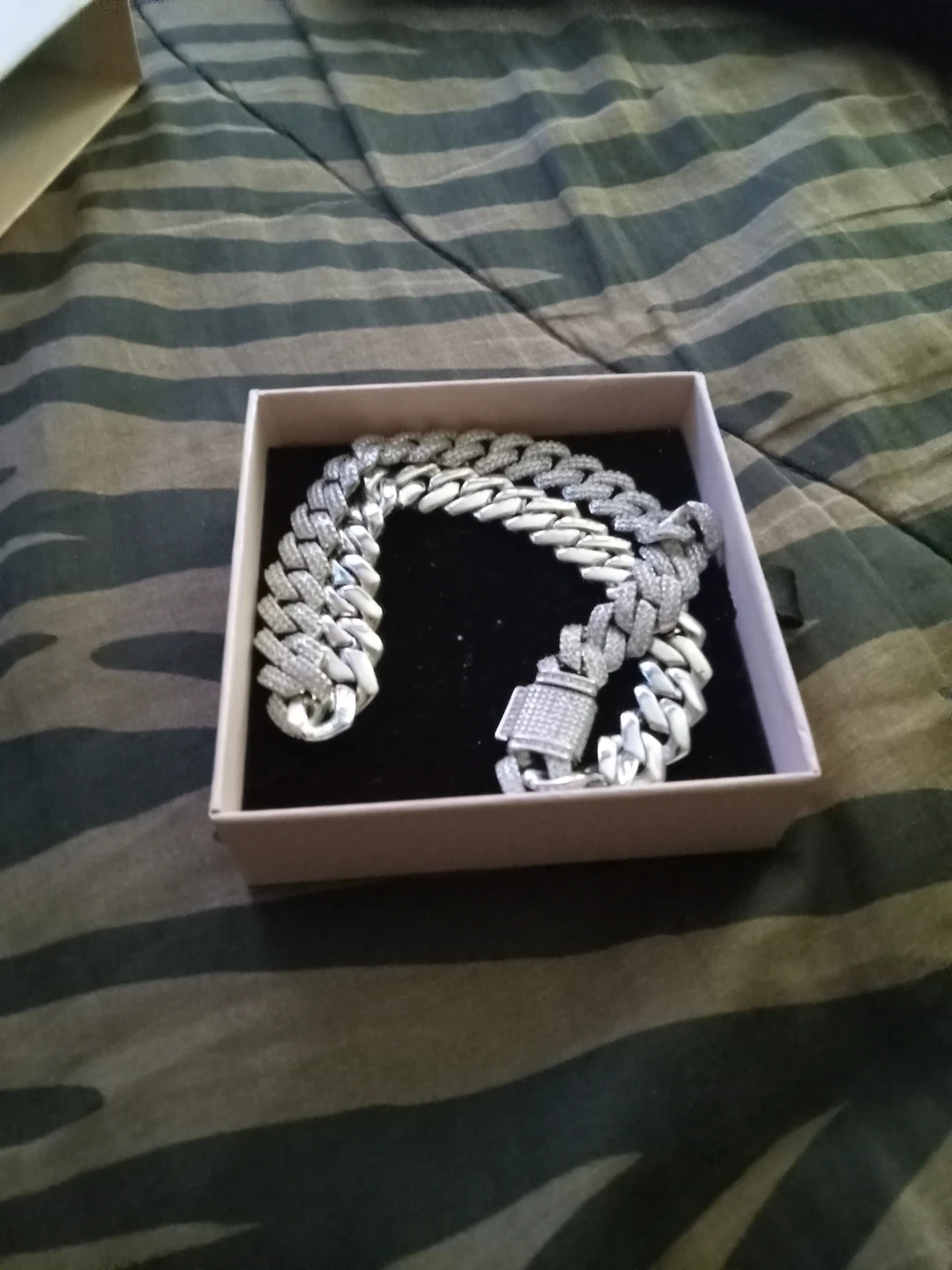 This Ice On Cuban link chain necklace features a striking design encrusted with rhinestones. It's presented in a gift box, ready to be worn or given. The chain's robust clasp ensures a secure fit.