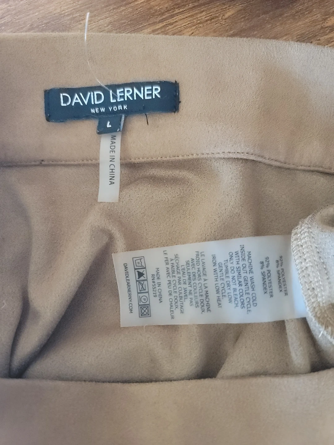 Selling a David Lerner skirt in a lovely tan color! It's a size L and made of 92% polyester and 8% spandex. The waist measures 14" and the length is 17". It's in great condition and ready for a new owner